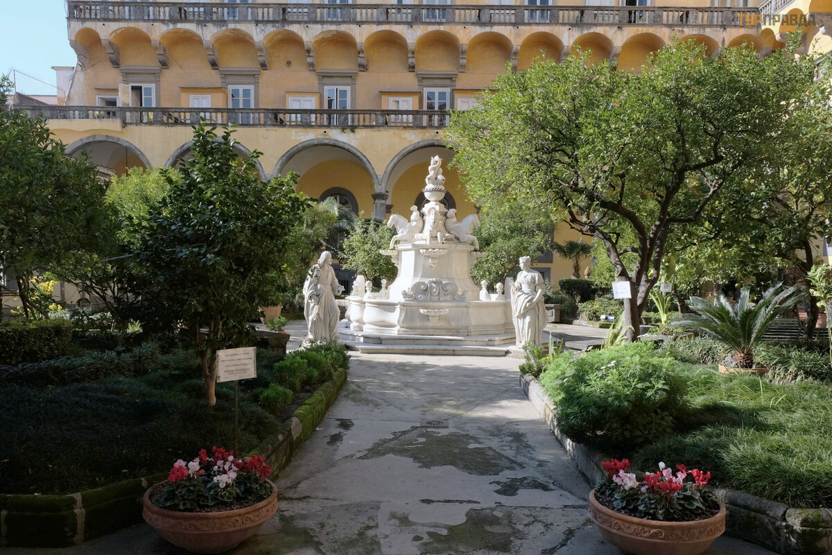 Przechodzimy na dziedziniec klasztorny, prawdziwą oazę na tle innych budynkó w w historycznym centrum Neapolu, gdzie wszystkie budynki stoją blisko siebie i tak naprawdę nie widać jednej fasady. Wspaniał y ogró d obsadzony drzewami owocowymi (pomarań cze, cytryny) i kwiatami.