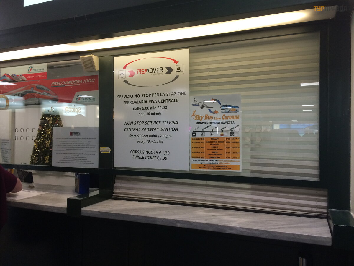 Lotnisko jest mał e i znajduje się tuż przy granicy z miastem. Z niego moż na dojś ć do dworca kolejowego, a takż e do gł ó wnej atrakcji – Krzywej Wież y w Pizie. Ale przeczytał em, ż e „pod koniec grudnia 2015 r. uruchomiono w peł ni zautomatyzowany pocią g PisaMover, któ ry poł ą czył lotnisko i dworzec centralny. Pocią gi kursują od 06:00 do 00:00 co 5-8 minut. Bilet — 1.30 €. » Pilnie trzeba znaleź ć ten cud techniki! Nie znalazł em : (( A raczej: PisaMover to,