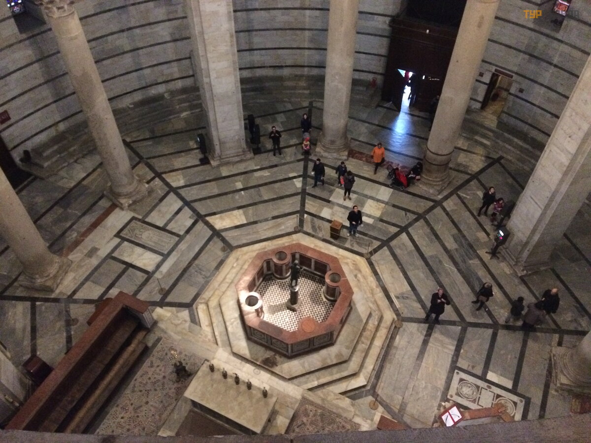 Dojś cie do wież y zaję ł o nam 40 minut, po czym udaliś my się do baptysterium (chrzcielnicy), najwię kszego we Wł oszech. Bardzo pię kny, przewiewny budynek z zewną trz.