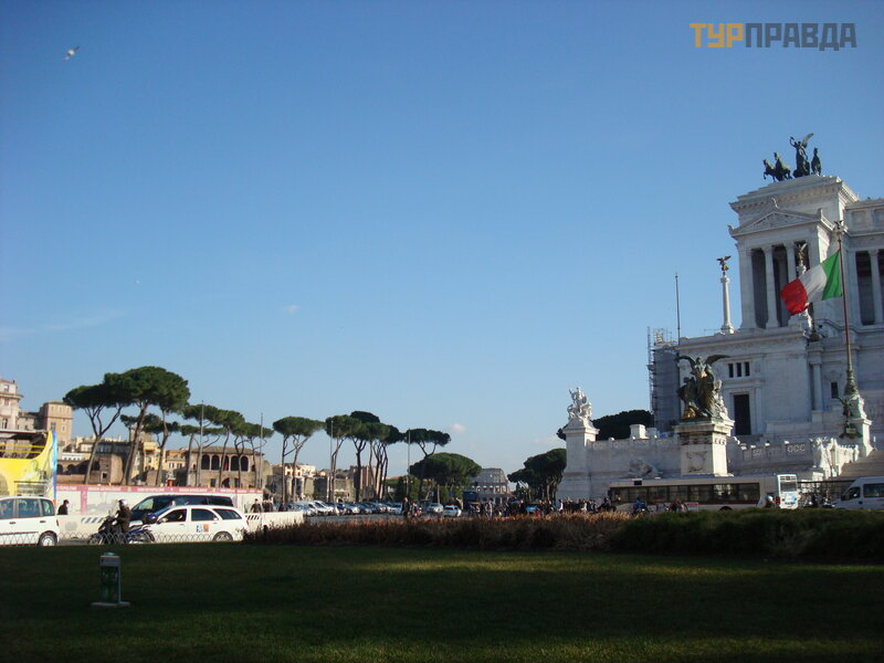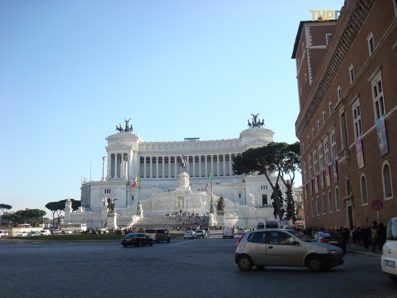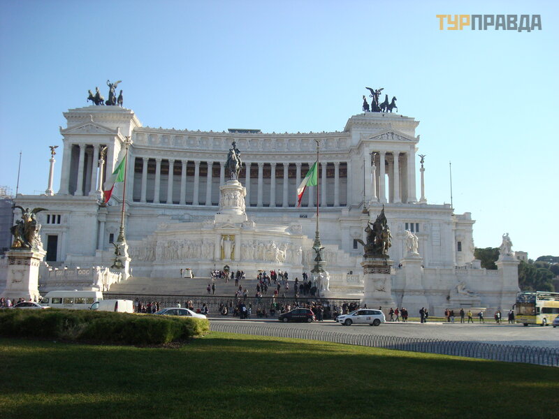 Jest to pomnik w stylu pseudorzymskim poś wię cony zwycię stwom Wł och i tym, któ rzy zginę li z nimi w wojnach. Cał a ta okazał a konstrukcja robi wraż enie, postanawiamy wejś ć na taras widokowy, któ ry jest prawie pod dachem (na dach jest winda, ale nie chcieliś my stać w dł ugiej kolejce). Polecam, nie prowadzą tam wycieczek, ale widoki Rzymu to coś ! Z lotu ptaka w jedną stronę - panorama Rzymu z widokiem na Tyber i cał y Lewy Brzeg z Watykanem, Pał acem Sprawiedliwoś ci i dalszymi wzgó rzami, gdzie na horyzoncie znajdują się parki, ś wią tynie, bazyliki - pomnik Garibaldiego. Z drugiej strony od Piazza Venezia prowadzi aleja staroż ytnych rzymskich foró w, wykopalisk i Koloseum.