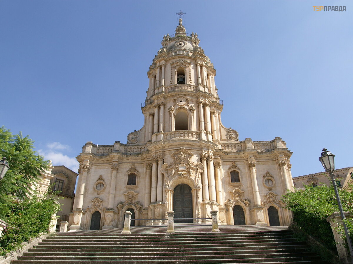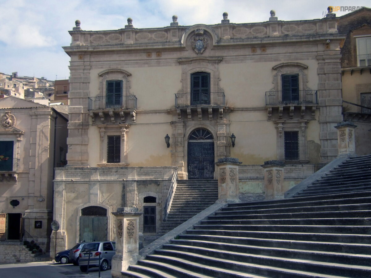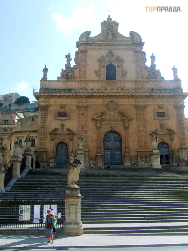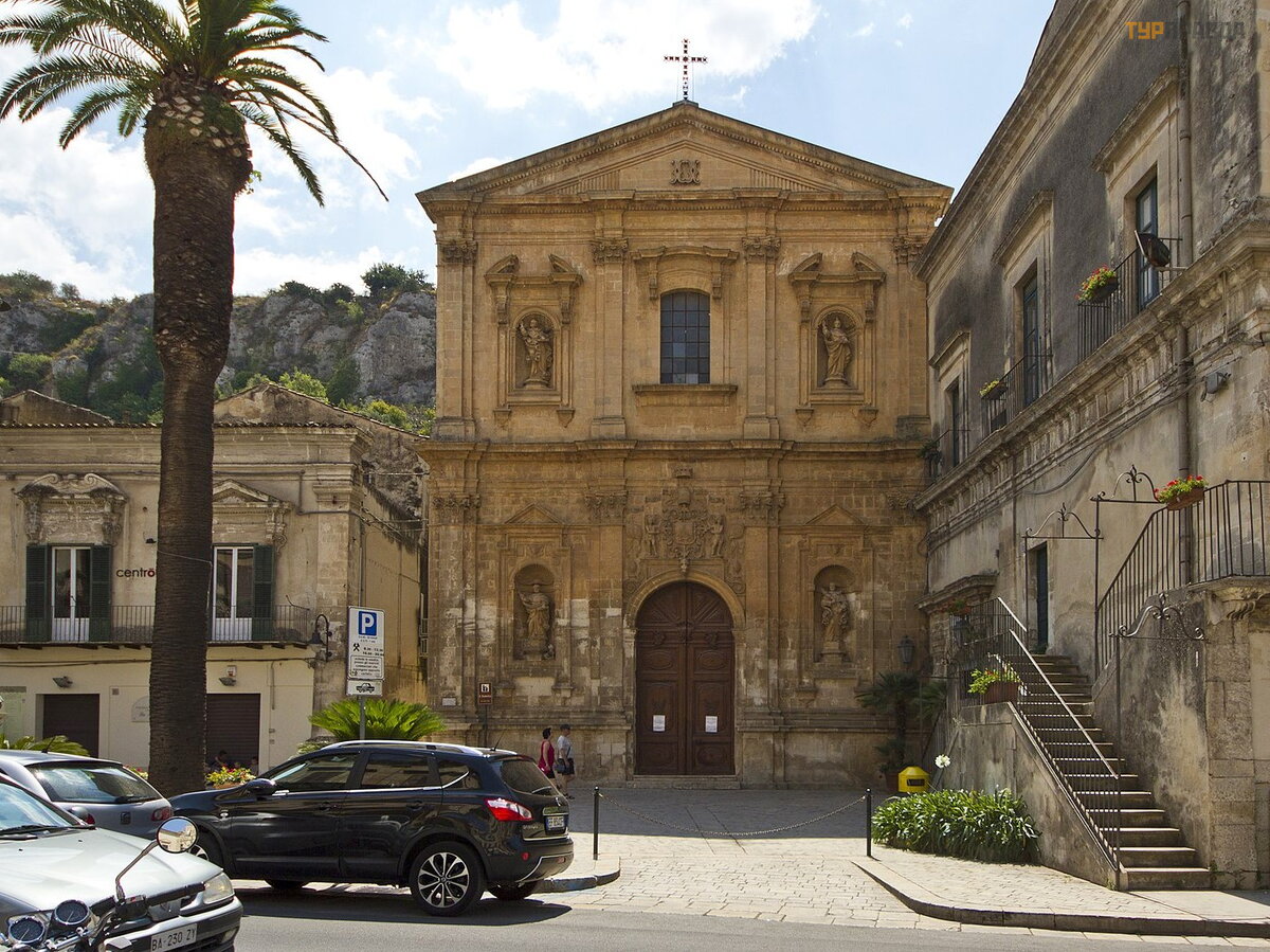 . . . w pobliż u katedry San Pietro (Dolna Duomo - Duomo Basso), któ ra jest ró wnież wpisana na Listę Ś wiatowego Dziedzictwa UNESCO. To kolejny imponują cy przykł ad sycylijskiego baroku z gł ó wną fasadą zwień czoną typową sycylijską barokową dzwonnicą o wysokoś ci 49 metró w.