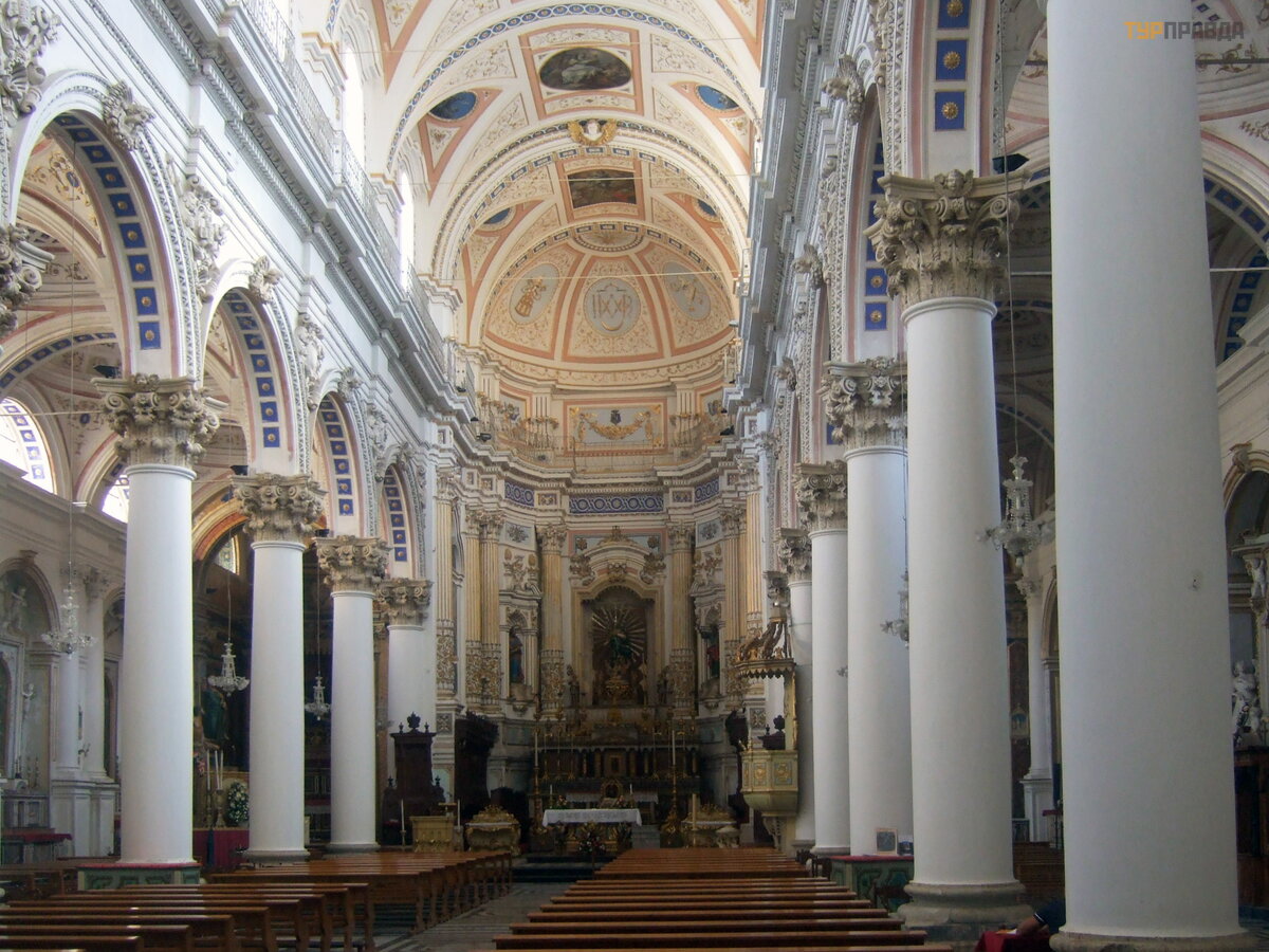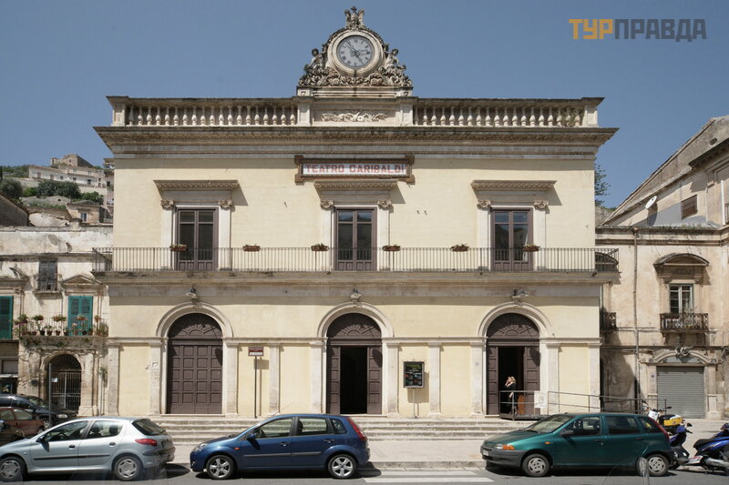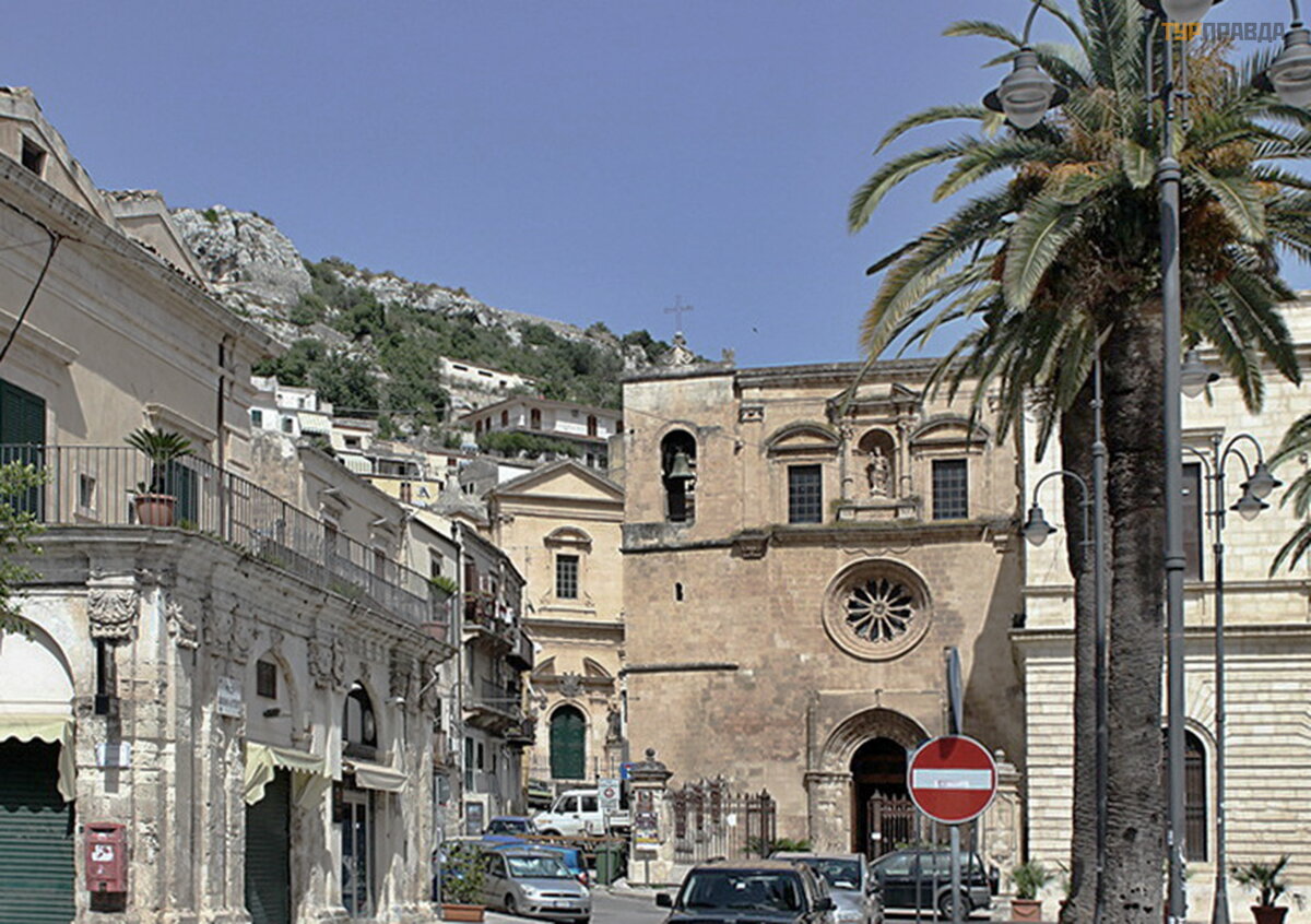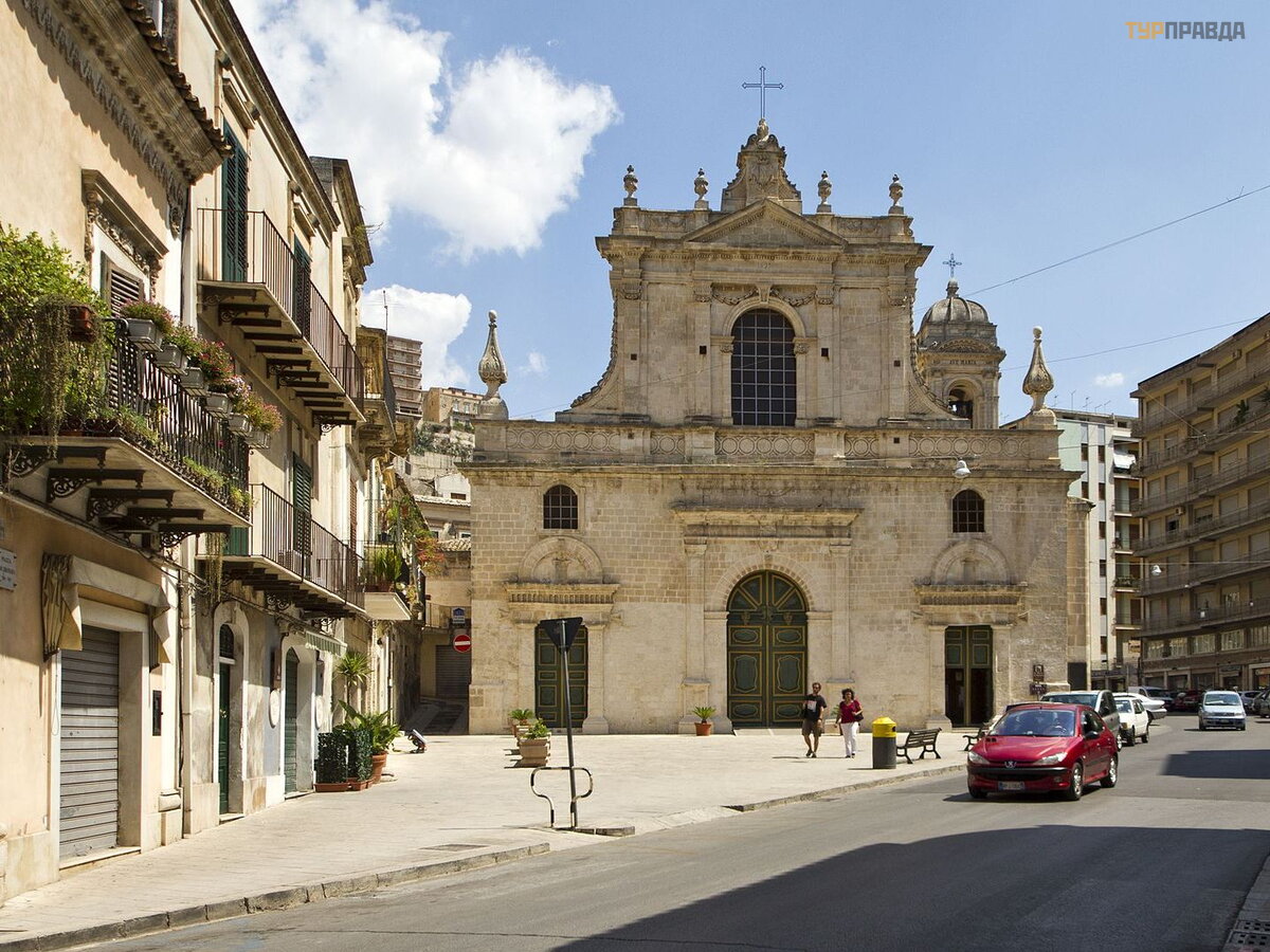 . . . w pobliż u katedry San Pietro (Dolna Duomo - Duomo Basso), któ ra jest ró wnież wpisana na Listę Ś wiatowego Dziedzictwa UNESCO. To kolejny imponują cy przykł ad sycylijskiego baroku z gł ó wną fasadą zwień czoną typową sycylijską barokową dzwonnicą o wysokoś ci 49 metró w.