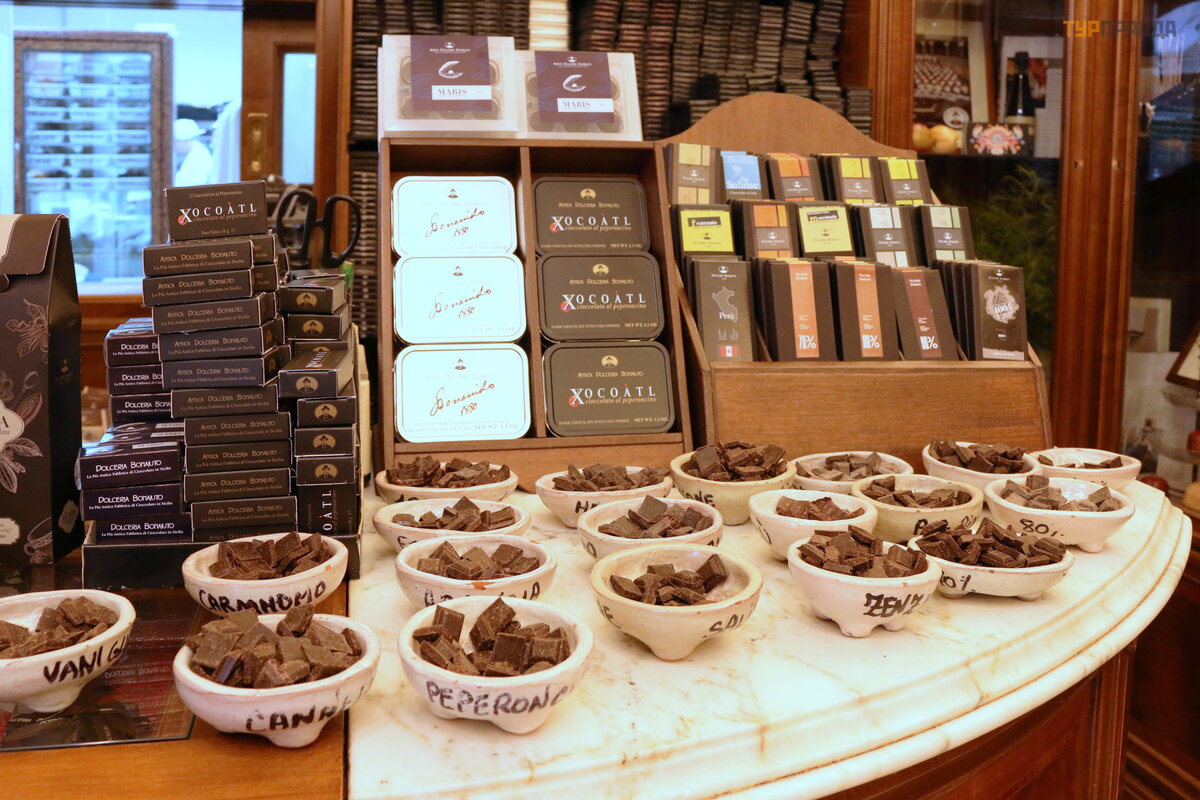 Poszliś my spró bować czekolady Modiki w sklepie marki Antica Dolceria Bonajutoс. Czekolada z ró ż nymi nadzieniami - z pieprzem, cynamonem, wanilią , winem itp. Modica uważ ana jest za jedną z czekoladowych stolic Wł och. Festiwal Chocobaroque odbywa się co roku w grudniu.
