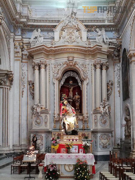 Po trzę sieniu ziemi w 1693 koś ció ł został odrestaurowany, a jego fasadę zdobią cztery posą gi przedstawiają ce San Cataldo, Santa Rosalia, Ś wię tego Piotra i Madonnę , a szczyt fasady wień czy rzeź ba Chrystusa .