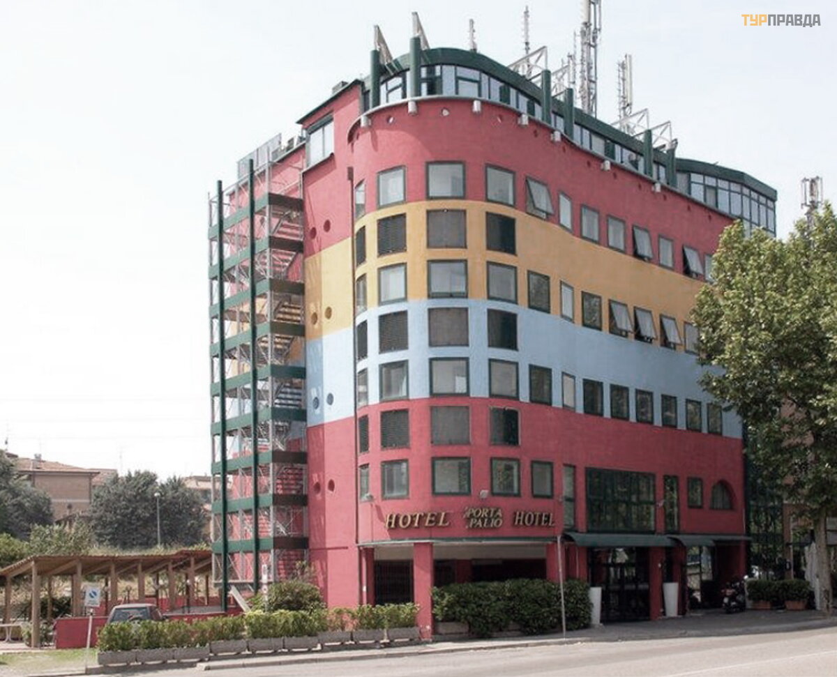 Zatrzymaliś my się w hotelu Porta Palio z kolorową fasadą , obok bram Porta Palio, okoł o dwudziestu pię ciu minut spacerem do gł ó wnej ulicy miasta. W pobliż u hotelu znajdują się dwa supermarkety - "LIDL" i "MD". Przez okna hotelu pł yną ł burzliwy kanał odwadniają cy.