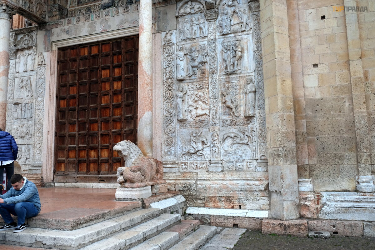 Mijamy Bramę Lwa - Porta Leoni (Porta Leoni). Antyczne rzymskie bramy, swoją nazwę zawdzię czają rzeź bom lwó w, któ re zdobią pobliski grobowiec.