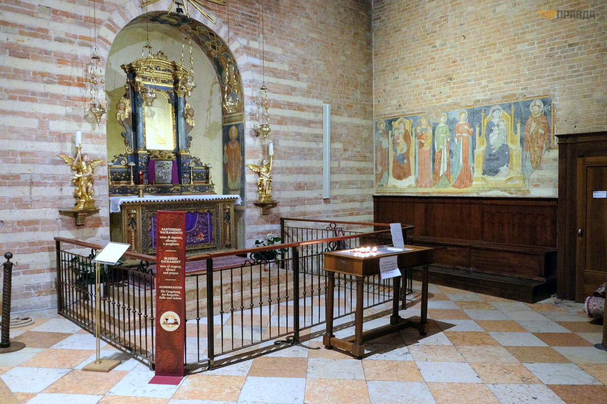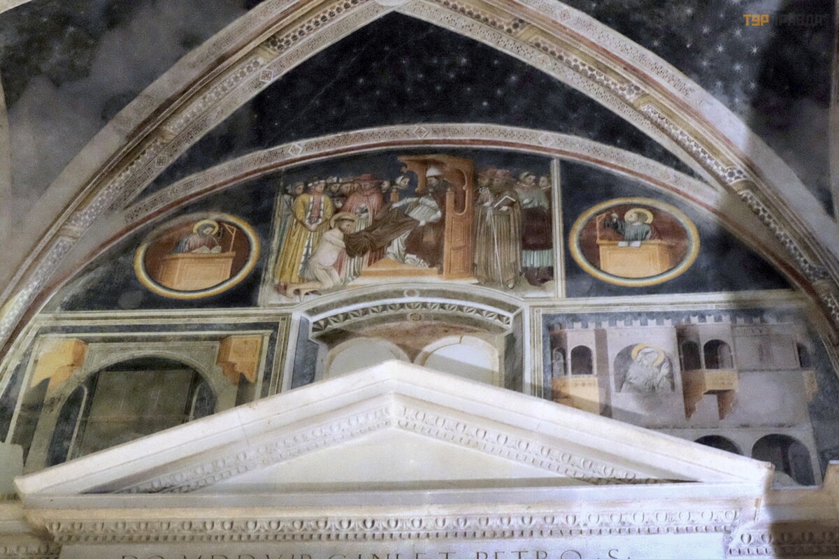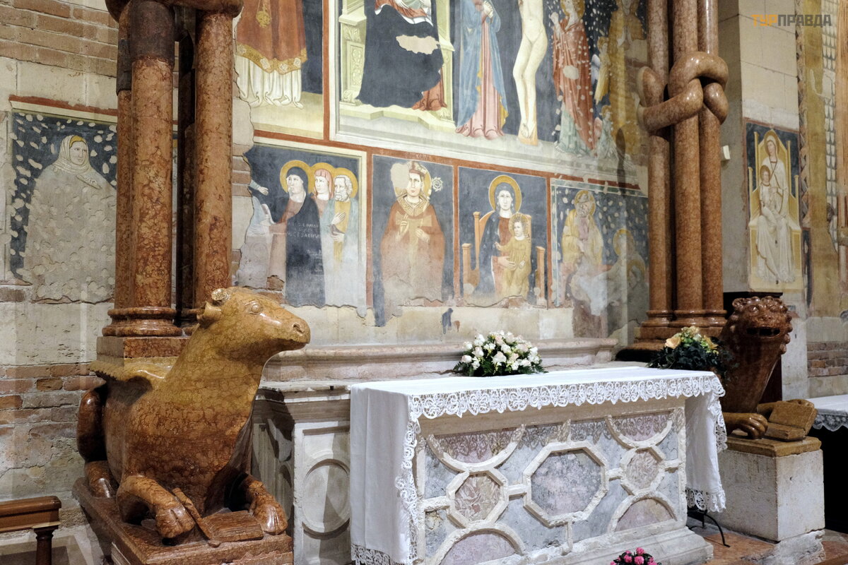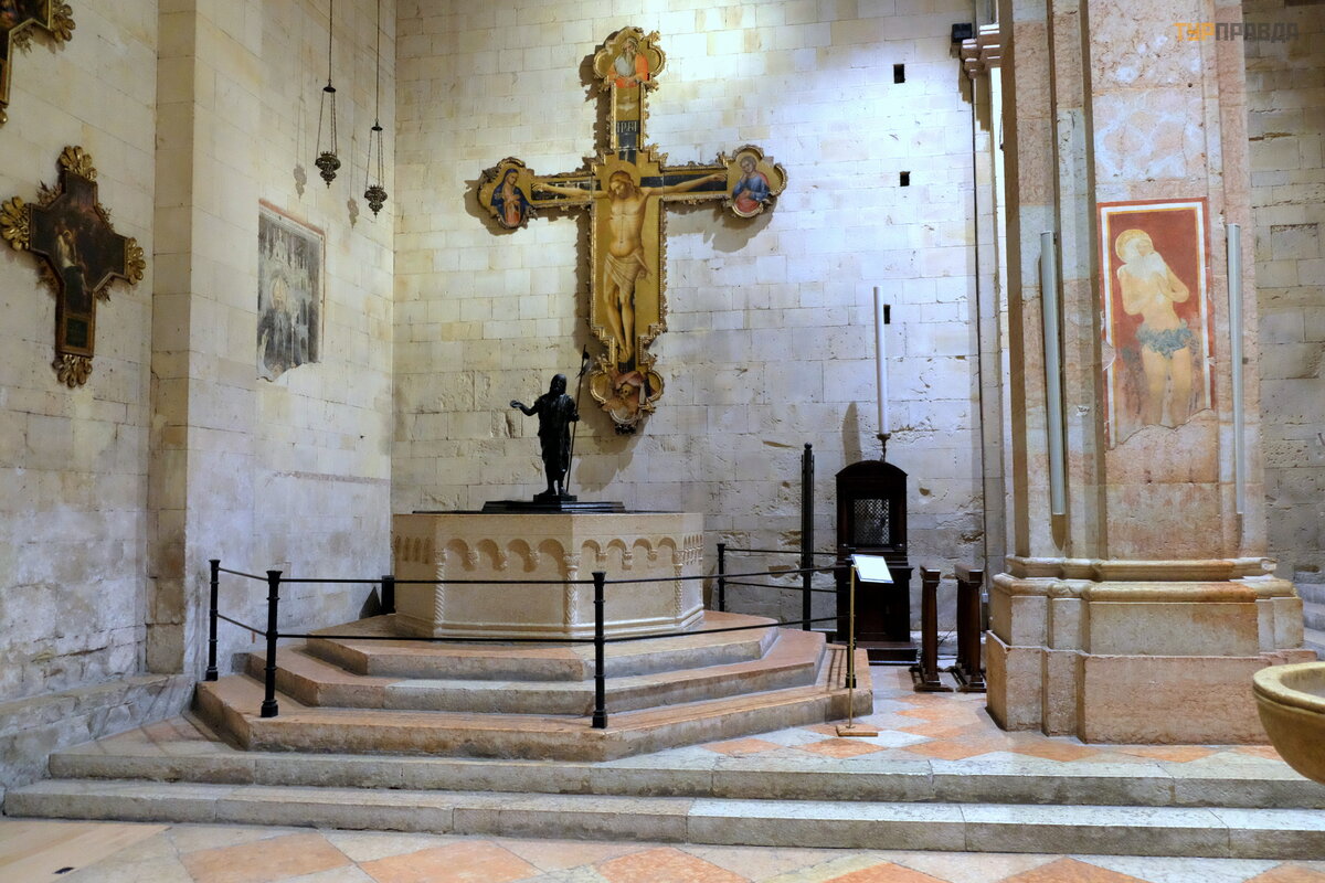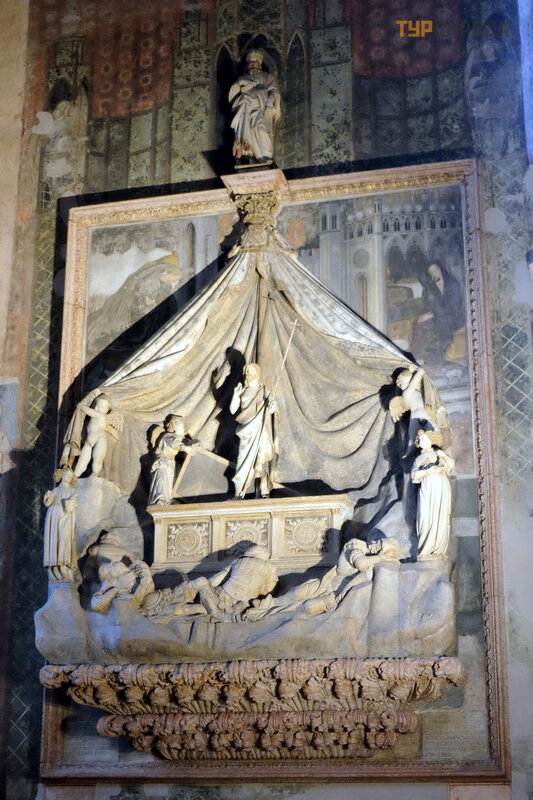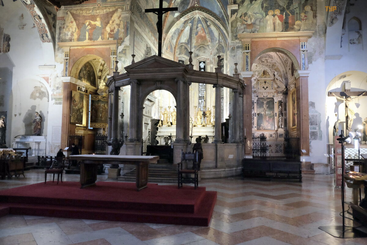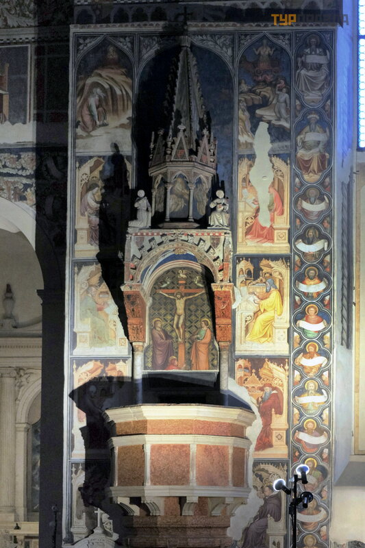 Ambona z 1360 r. , przykryta gotyckim baldachimem i otoczona freskami autorstwa Martino da Verona.