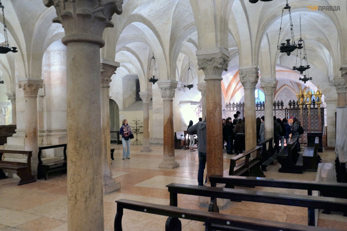 Pod prezbiterium znajduje się krypta, do któ rej prowadzą dwie klatki schodowe. Sklepienia ś wią tyni spoczywają na masywnych kolumnach, a nawa gł ó wna na dwó ch poprzecznych pó ł kolistych ł ukach.