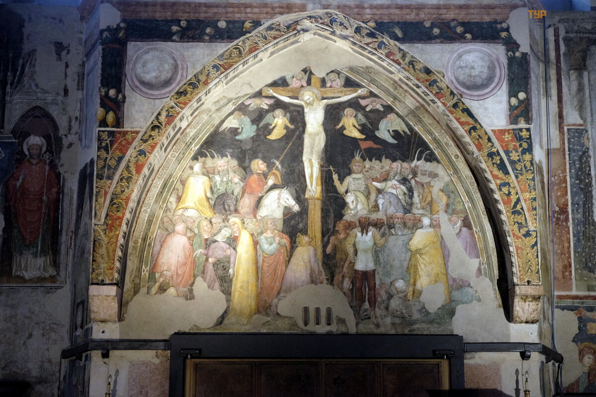 W lunecie na ś cianie wejś ciowej znajduje się fresk „Ukrzyż owanie” Turone z 1363 roku.