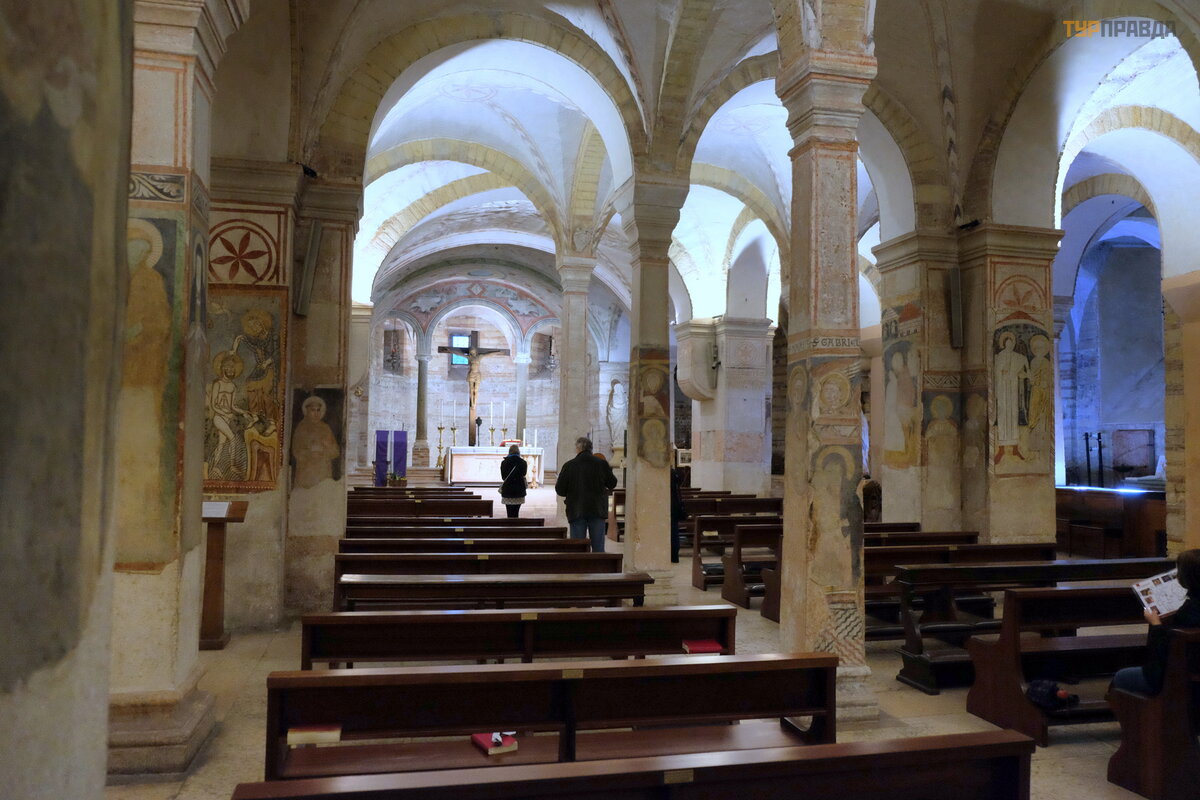 Wł aś ciwie nie jest to jeden, ale dwa koś cioł y: widać to szczegó lnie wyraź nie z zewną trz, gdzie gotyckie elementy absydy wień czą surowy romań ski fundament. Koś ció ł ś w. Ferma został zbudowany na miejscu mę czeń stwa dwó ch chrześ cijan w 361 roku. Nazywali się Fermo i Rustic. Z jakiegoś powodu koś ció ł nosi imię tylko jednego mę czennika. Koś ció ł dolny pochodzi z 1065 r. ,