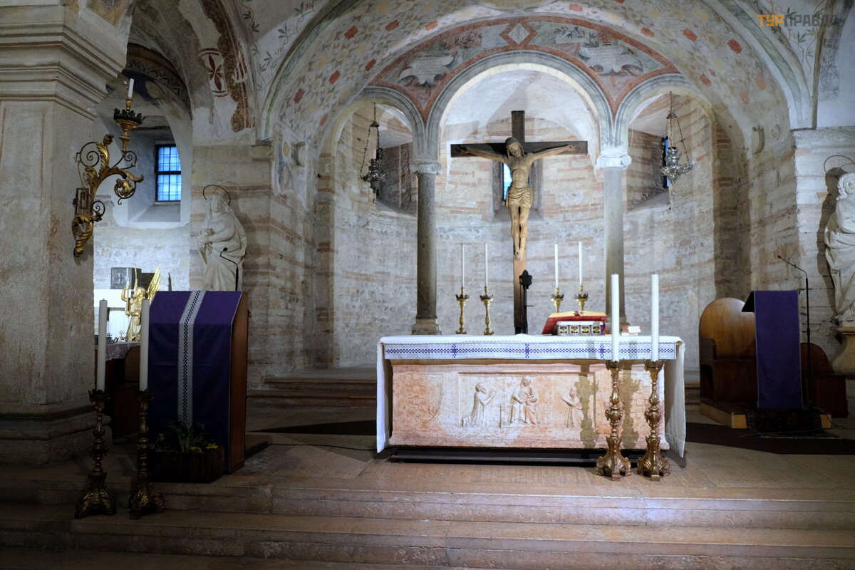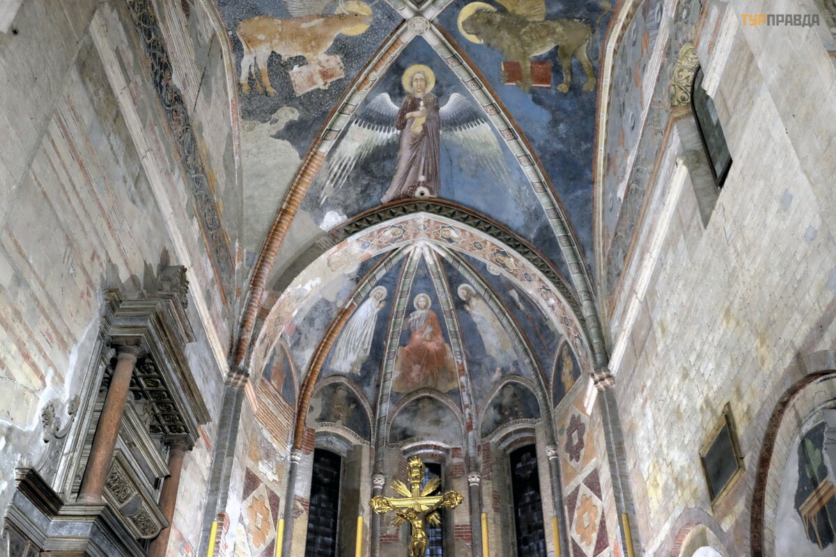 Oł tarz gł ó wny koś cioł a znajduje się za pó ł okrą gł ą kolumnadą i jest ozdobiony freskami z XIV wieku.
