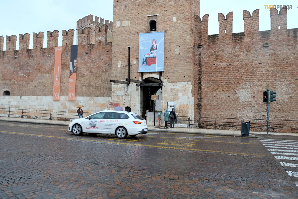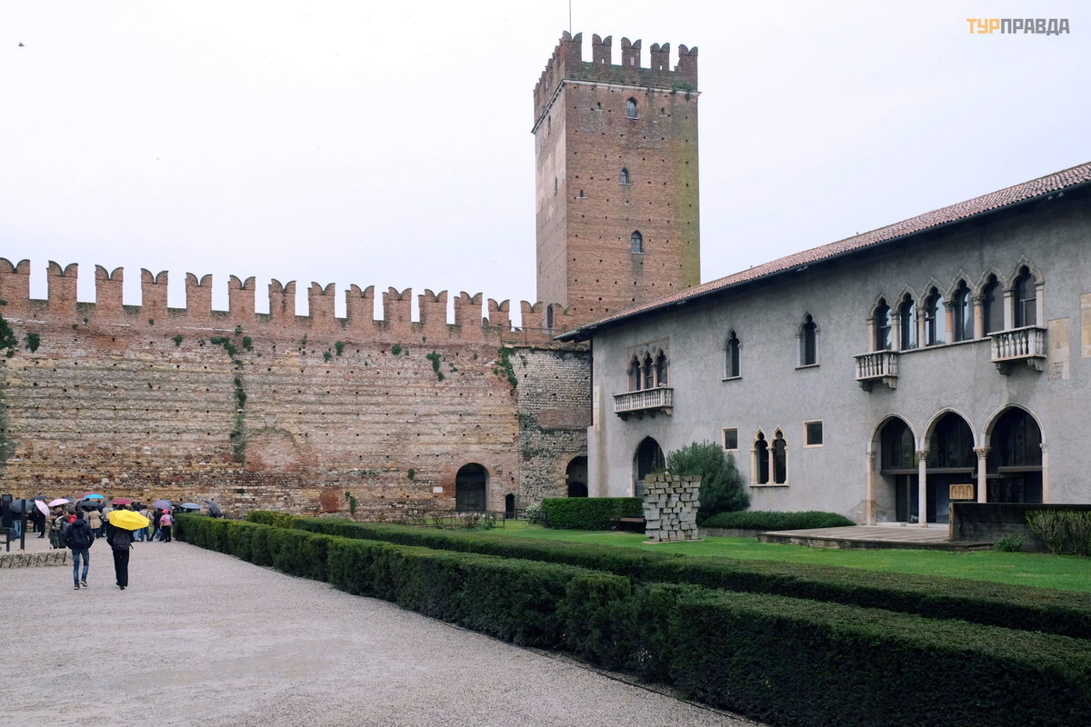 W zamku znajduje się bardzo ciekawe muzeum miejskie Castelvecchio (Museo di Castelvecchio) ze wspaniał ą galerią sztuki, któ re odwiedziliś my kilka lat temu. Obecnie wzdł uż obwodu zamku wznosi się sześ ć potę ż nych wież , otoczonych gł ę boką fosą , przez któ rą pł yną wody kanał u Adigetto.