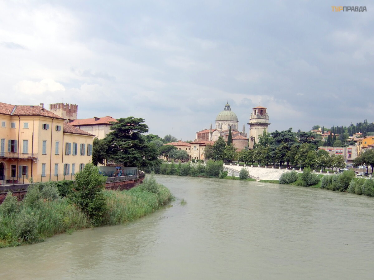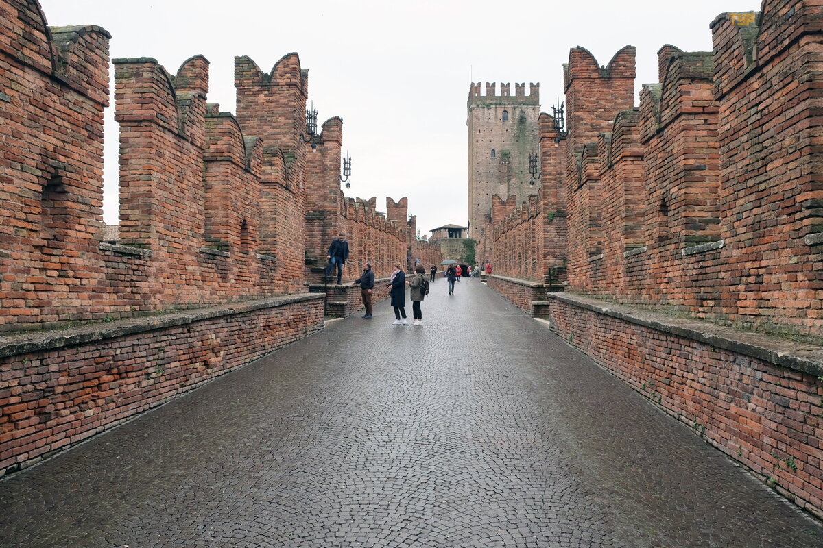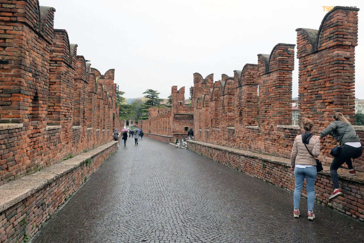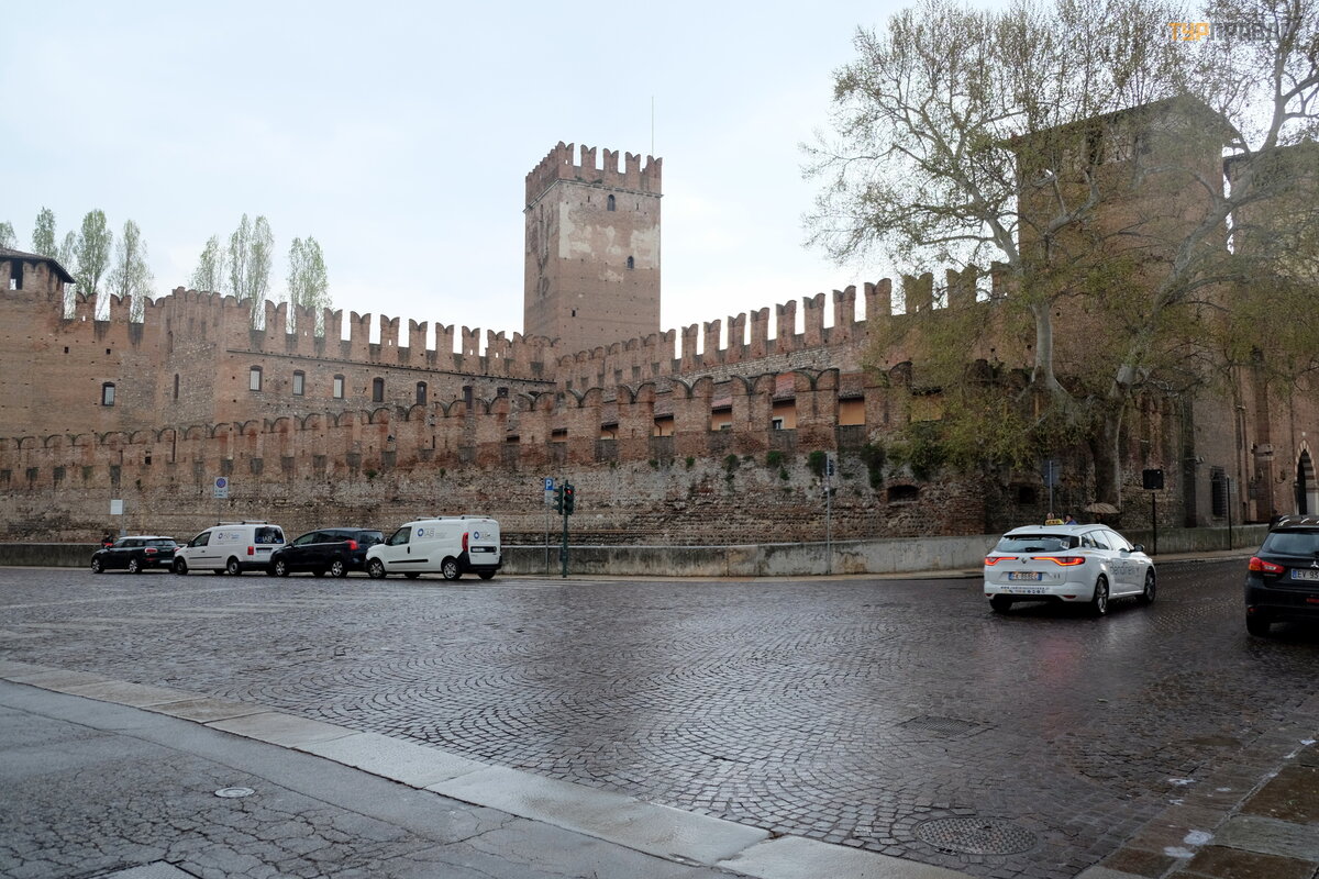 Nastę pnego dnia pogoda się poprawił a, chociaż był o pochmurno i pojechaliś my dalej zwiedzać miasto. Ponownie weszliś my na Stare Miasto przez bramy Porta Palio i skierowaliś my się do „starego zamku” - Castelvecchio (Castelvecchio), pochodzą cego z epoki Scaligeri, należ ą cego do rodziny Della Scala. Jest to kompleks o gigantycznych rozmiarach, w skł ad któ rego wchodzi most obronny z blankami przerzuconymi przez Adygę .