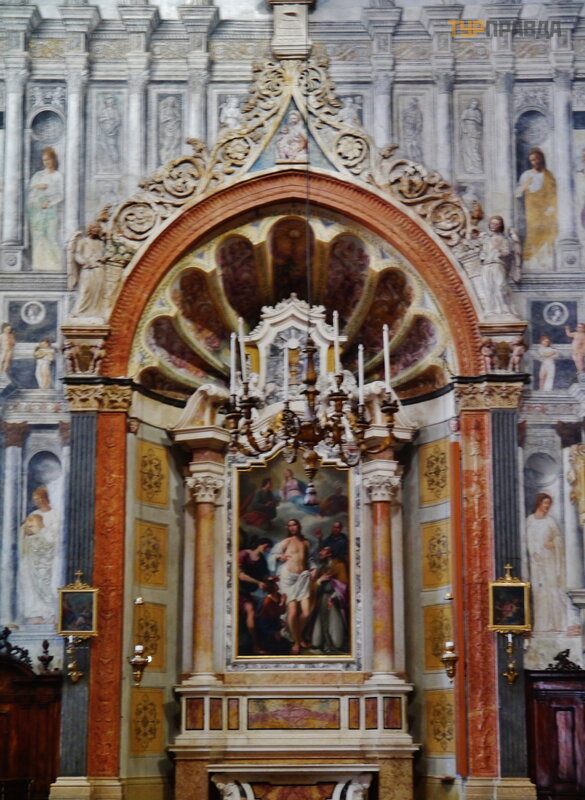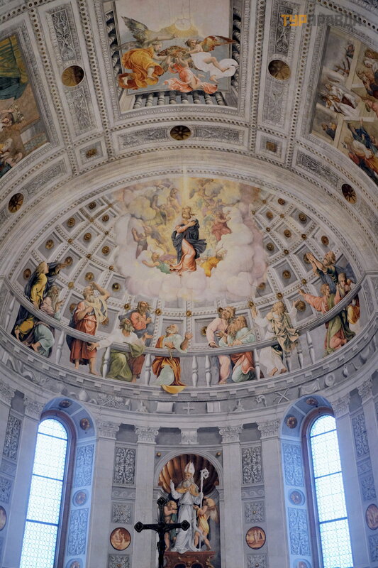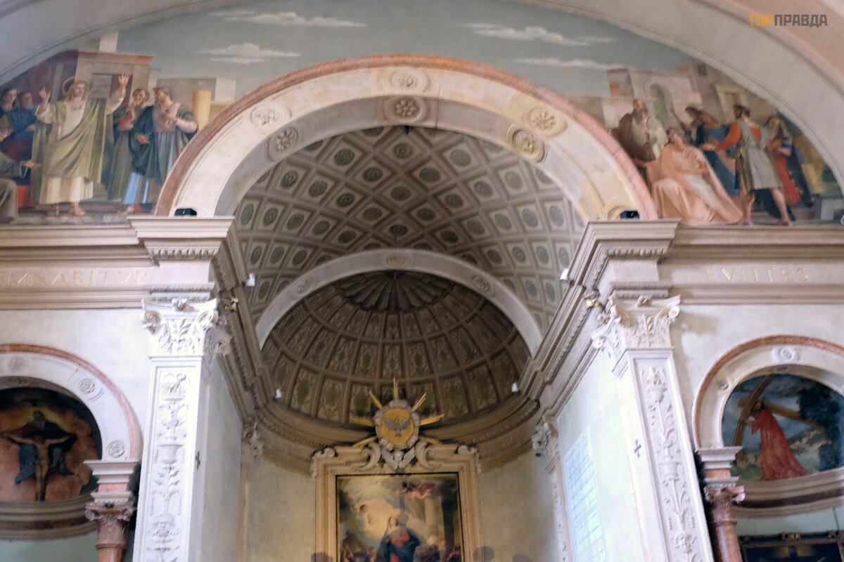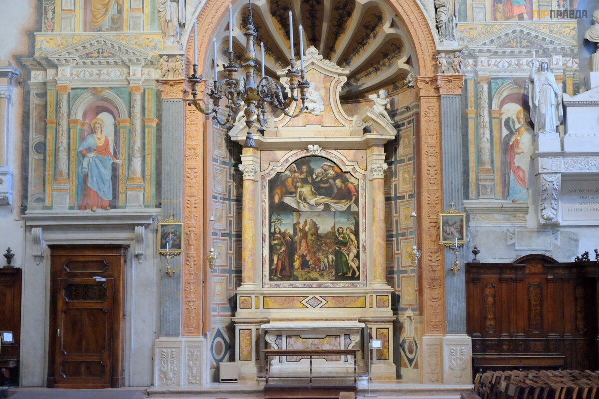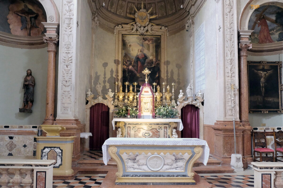 Apsydę zdobią freski „Zwiastowanie”, „Spektakl w ś wią tyni”, „Narodzenie”, epizody z ziemskiego ż ycia Matki Boskiej, figury prorokó w, namalowane w XVI wieku przez weroń skiego malarza Francesca Torbido na podstawie tektur Giulio Romano.