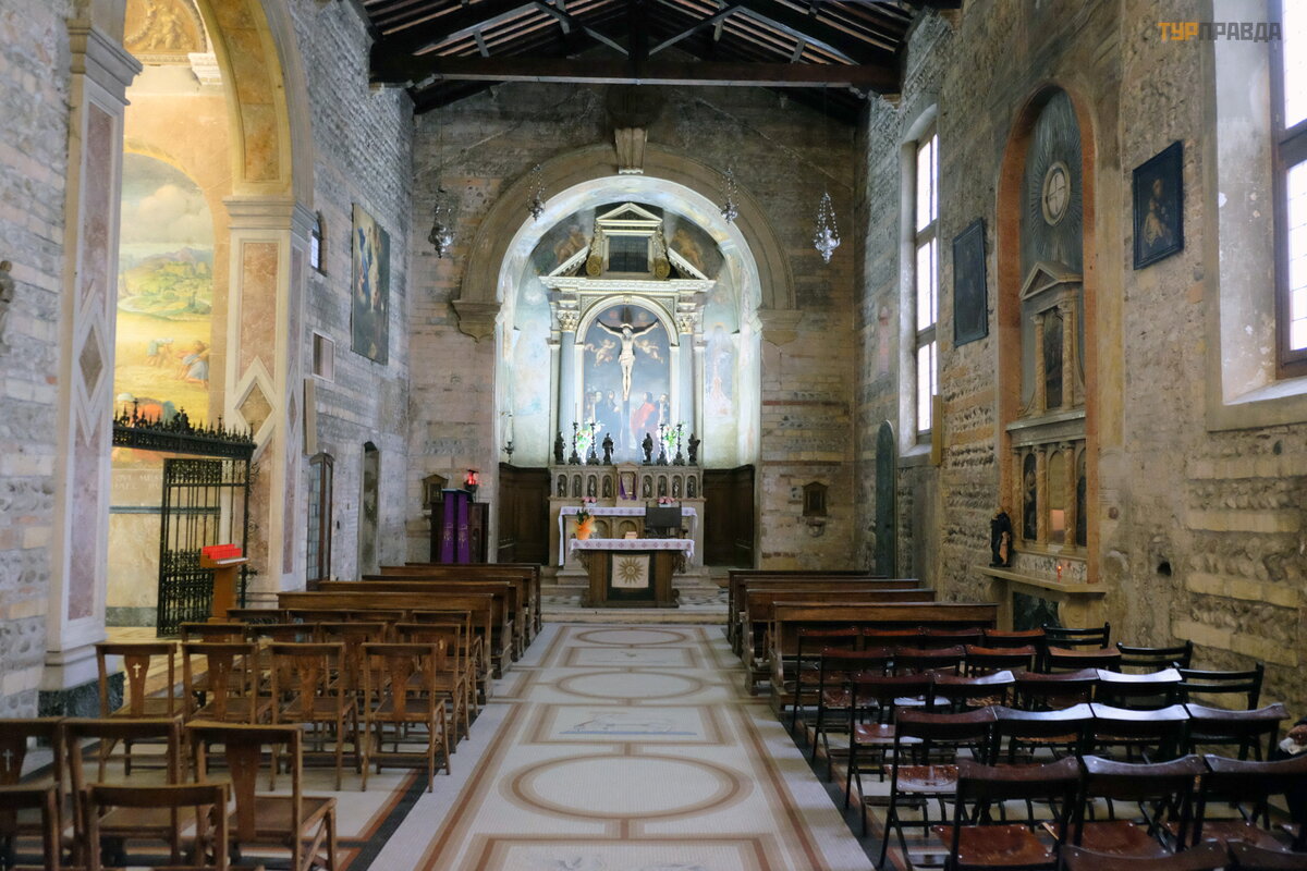 W pobliż u mostu Ponte Pietro znajduje się koś ció ł ś w. Jednocześ nie architektura muró w jako cał oś ci został a zachowana od czasu budowy koś cioł a, a ś wią tynia ta był a jedną z nielicznych budowli, któ re przetrwał y trzę sienie ziemi z 1117 roku. Ró wnież jego dzwonnica powstał a w XII wieku.