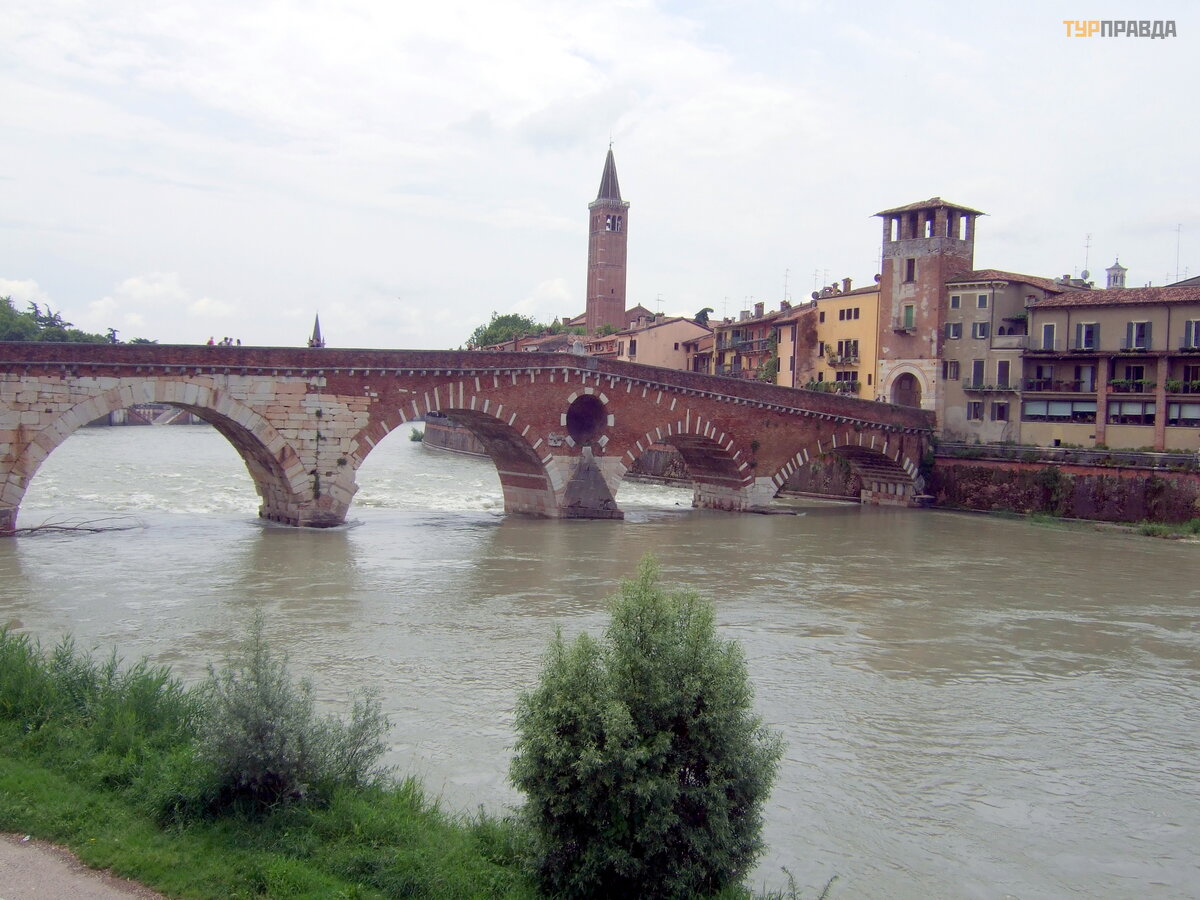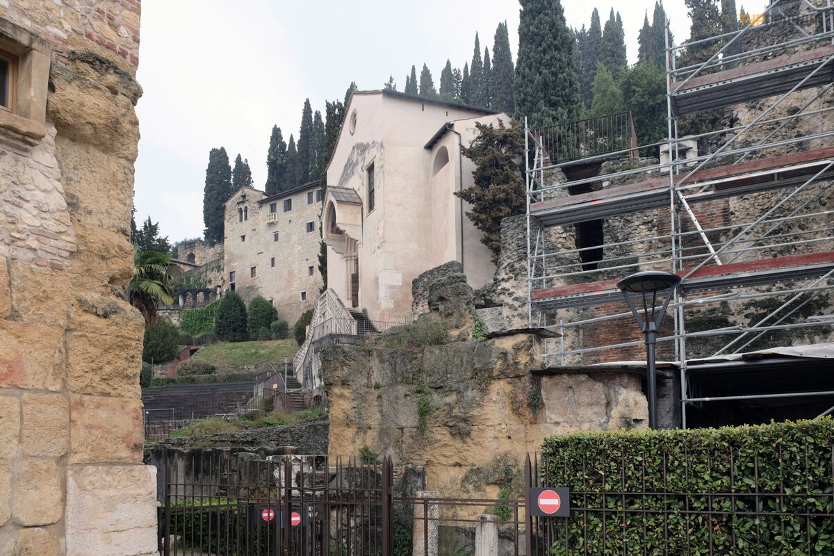 Prowadzi do niego most Ponte Pietra – jedyny ł ukowy most w Weronie, któ ry powstał w czasach Cesarstwa Rzymskiego i przetrwał do dziś niemal w swojej pierwotnej formie. Po imponują cym okresie stania, w 1239 r. zawalił się i na jego miejscu zbudowano nowy, ale już z kamienia. Mostu strzegł a wież a straż nicza Torre di Guardia, zbudowana w XIII wieku.
