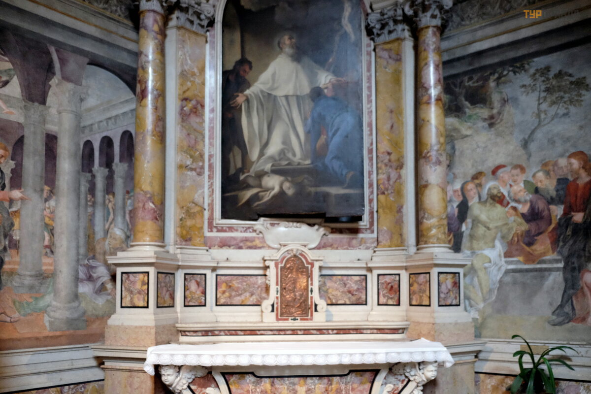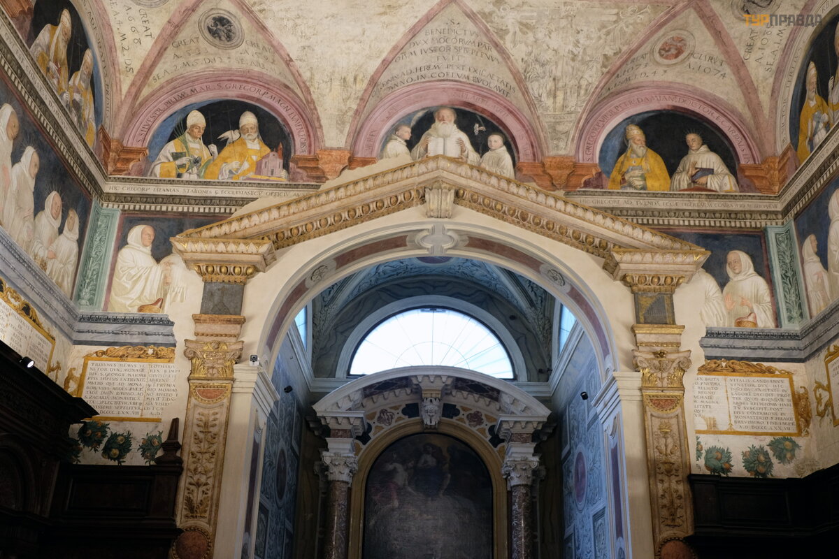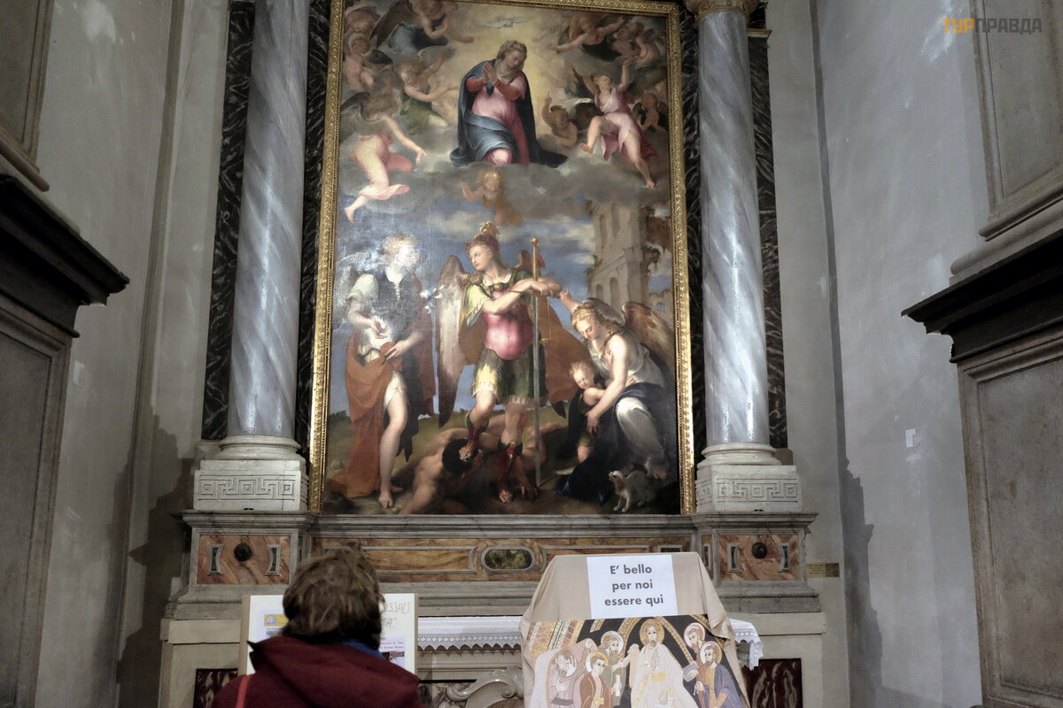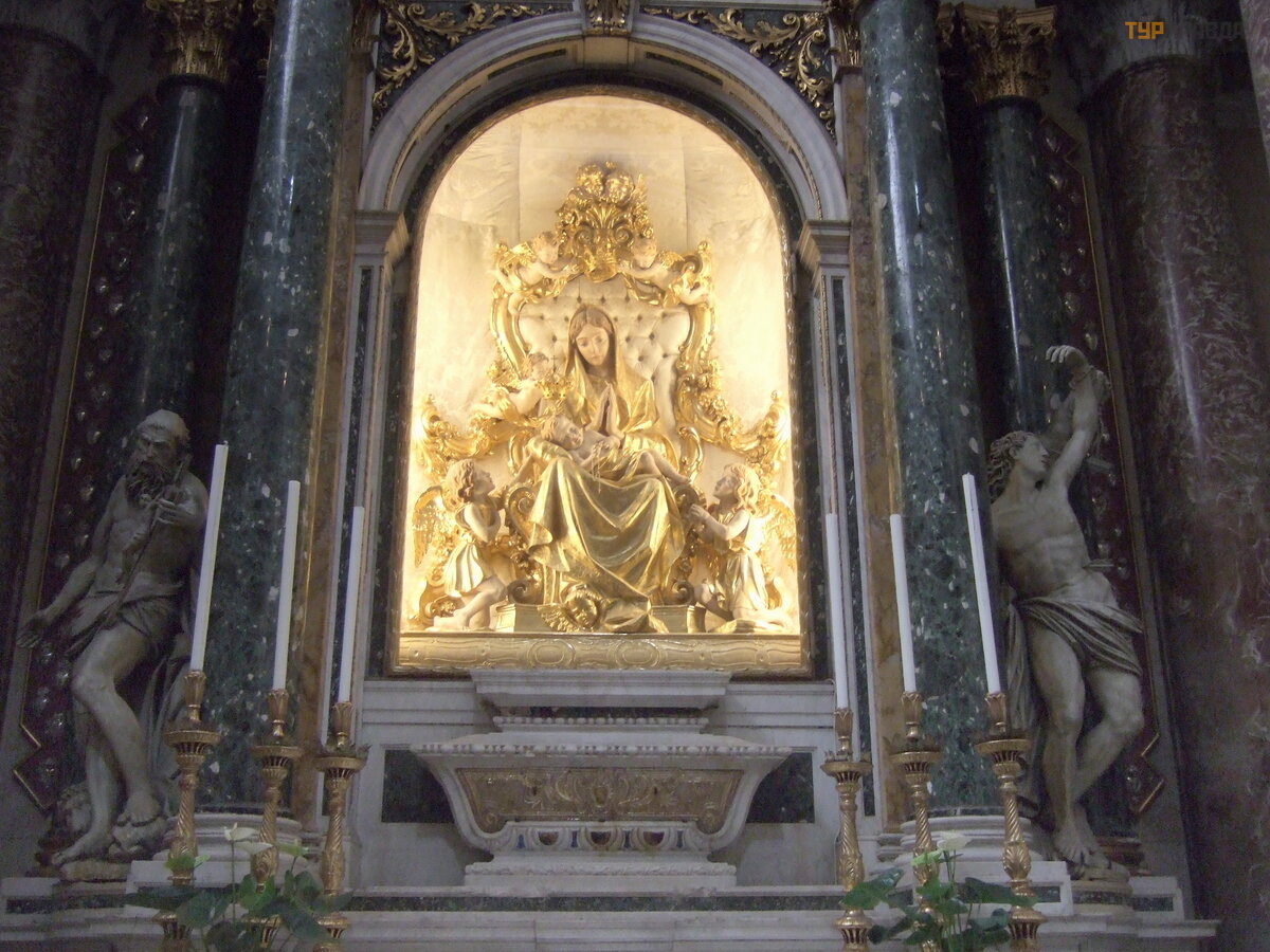 Tutaj każ dy element jest prawdziwym arcydzieł em: kolumny z czerwonego marmuru, wspaniał e sklepienia ze zł otymi gwiazdami na niebieskim tle, pozł acany wizerunek Matki Boskiej w kaplicy Madonna del Popolo, czyli „Madonna ludowa”, wyró ż nia się .