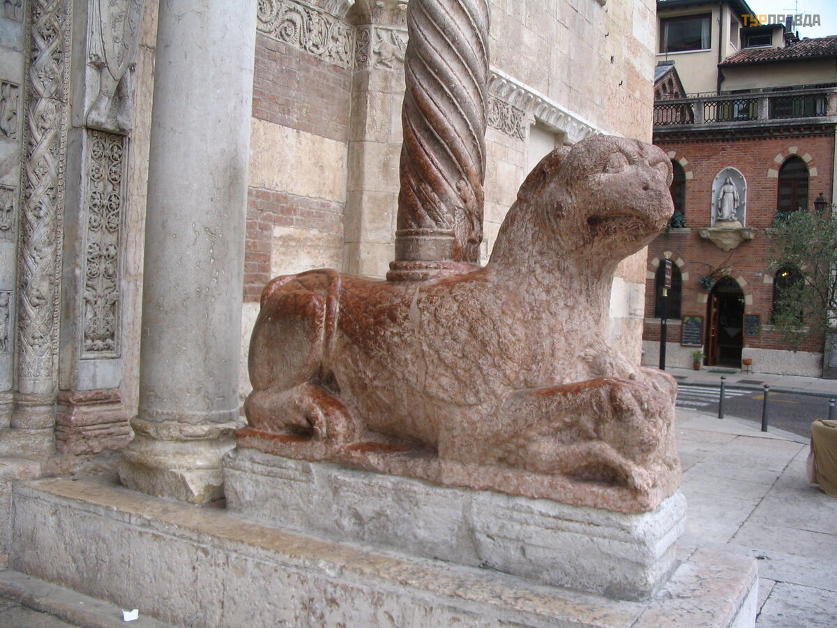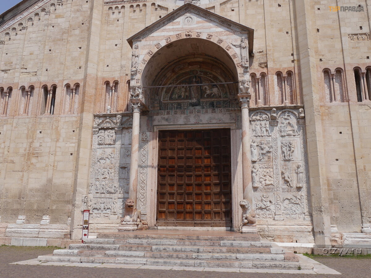Portal wejś ciowy z portykiem na skrę conych kolumnach wspartych na skrzydlatych kolumnach pozostał z pierwotnego wyglą du romań skiego. gryfony. Stworzył go mistrz Nikolo, autor portalu wejś ciowego bazyliki San Zeno Maggiore.