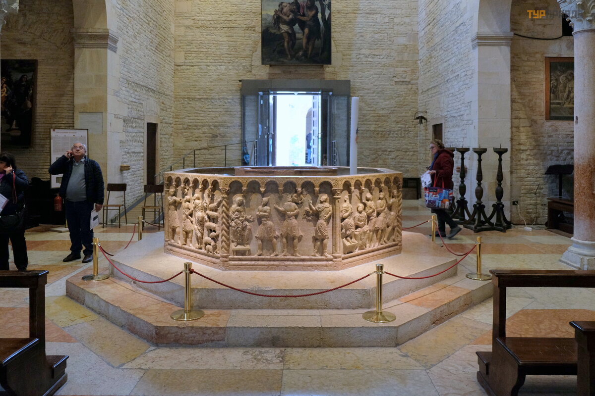 Perł ą koś cioł a San Giovanni in Fonte jest chrzcielnica (ok. XIII w. ), przypominają ca kształ tem oś mioką ta i marmur werony, z któ rej wyrzeź biono chrzcielnicę w bazylice San Zeno. Ze wzglę du na swoją niezwykł ą ż ywotnoś ć i wdzię k rzeź biarską dekorację chrzcielnicy moż na zaliczyć do szczytó w ś redniowiecznej sztuki Werony.
