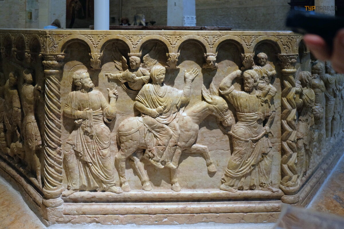 Chrześ cijań skie tematy są przedstawione na pł askorzeź bach twarzy czcionki. Historycy sztuki uważ ają , ż e autorami tych pł askorzeź b był Brioloto, któ ry wyrzeź bił takż e „Koł o fortuny” (rozeta) w bazylice San Zeno, oraz inny wybitny rzeź biarz, najwyraź niej należ ą cy do szkoł y wenecko-bizantyjskiej.