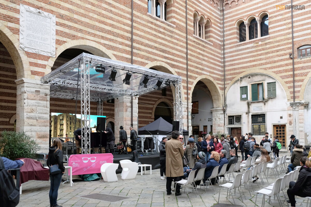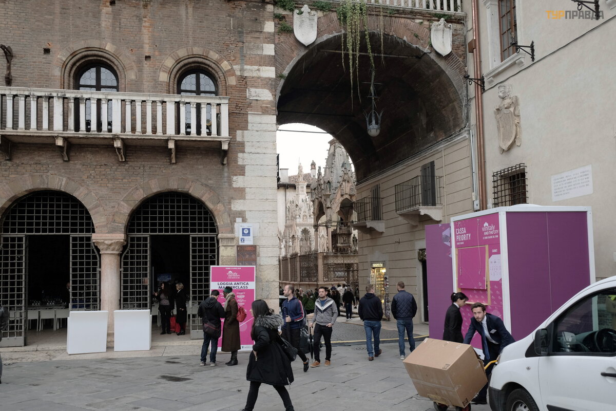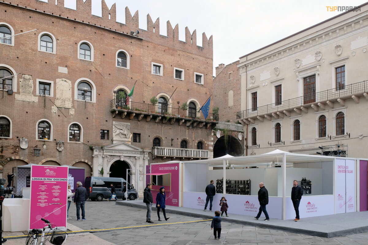 Potem spacerowaliś my trochę po mieś cie, w tym czasie w Weronie odbywał y się targi wina, na placach powstawał y pawilony i miejsca na pokazy.