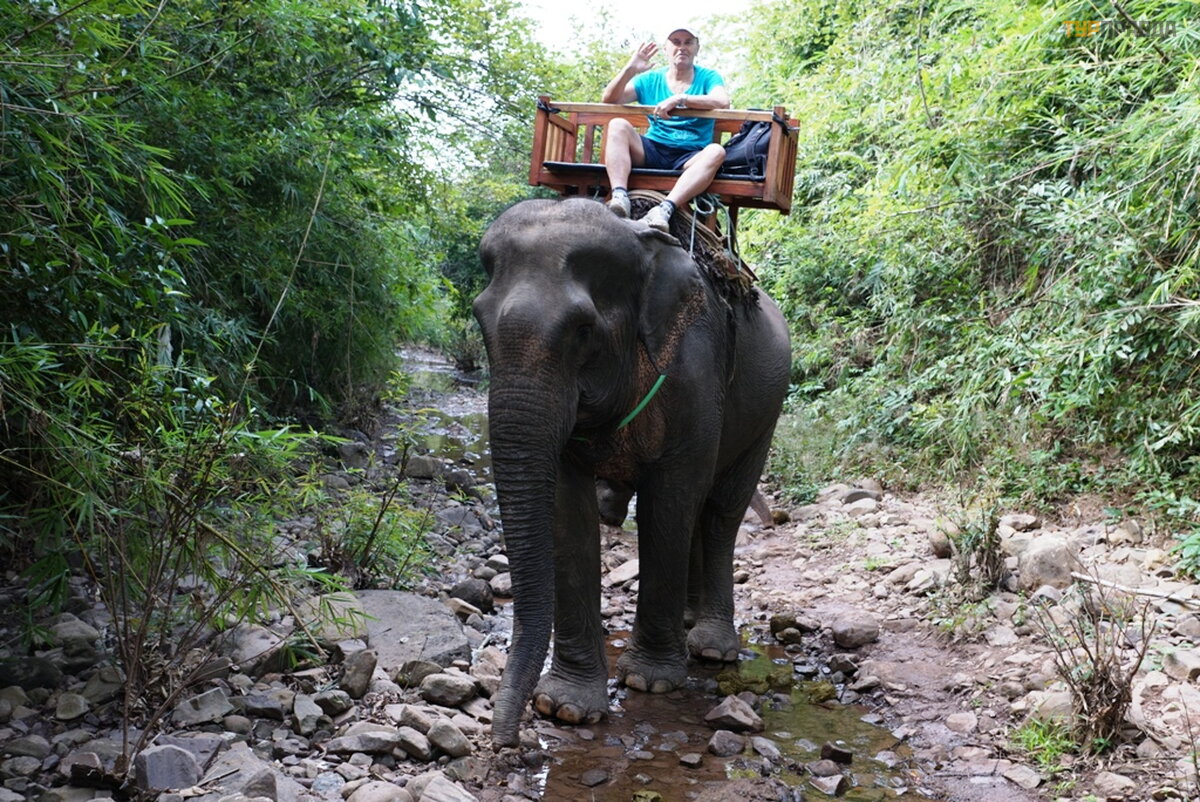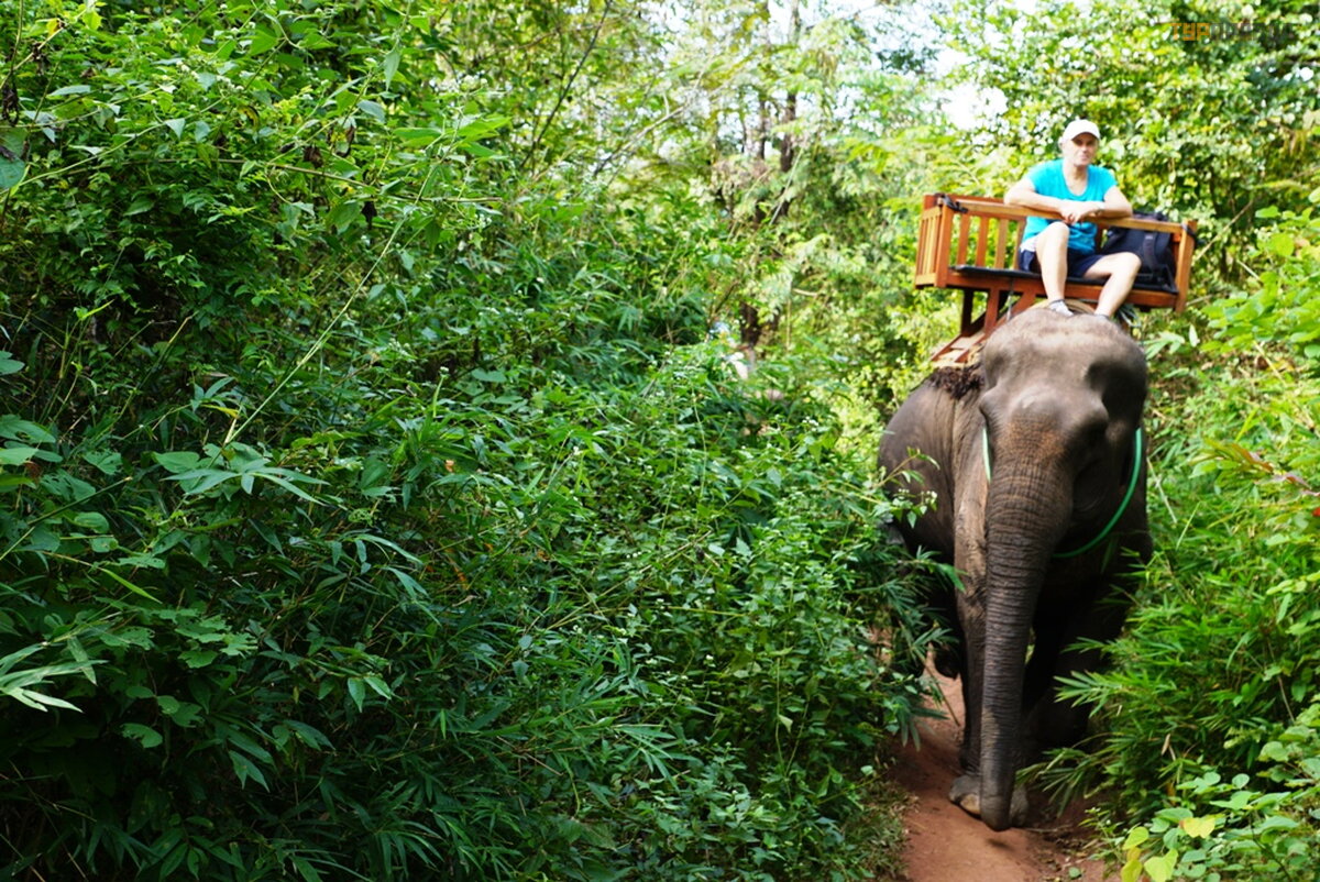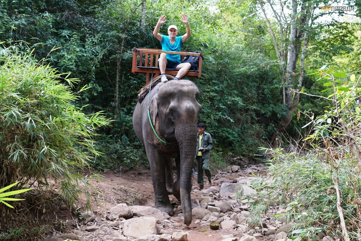 Jechaliś my przez okoł o godzinę okropną drogą . Nad brzegiem rzeki Mekong znajduje się kawiarnia, a wraz z nią sł onie, któ re toczą turystó w. To miejsce jest bardzo pię kne. Wś ró d drzew widział em sł onie przywią zane ł ań cuchem u nogi do drzewa. Jest to dla nich ś wię to. Po Tajlandii obiecał em sobie, ż e już nie usią dę na sł oniu, po tym jak zobaczył em niegrzeczne nastawienie kornakó w do sł oni, któ rzy bili sł onie po gł owie hakami, dopó ki nie wykrwawił y się . Co wię cej, trzeba tu dodać , ż e prawie wywró cił się wraz ze sł oniem do wą wozu, gdzie sł oń się gną ł trą bą po soczystą trawę . Czas miną ł , wszystko został o zapomniane. Ponadto zbadał em mojego sł onia i woź nicę , któ ry miał tylko cienki prę t. Widać był o, ż e sł oń był dobrze traktowany, tylko jego oczy był y smutne. Ciekawe, czy kiedykolwiek chciał uciec do dż ungli do swoich wolnych braci? Niestety nigdy nie powie. Przez prawie dwie godziny tarzał mnie przez rowy, kamienie i lasy.