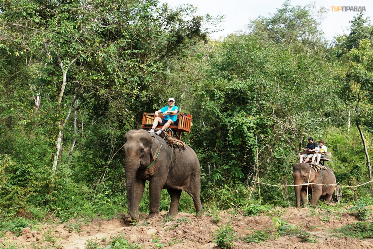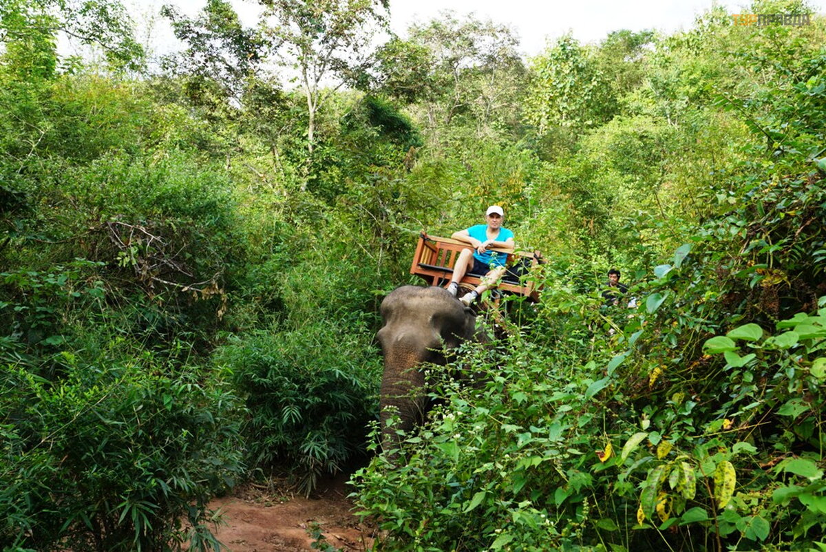 Postanowił em wybrać się na wycieczkę do dż ungli, gdzie znajduje się obó z sł oni i osada kilku domó w nad brzegiem rzeki.