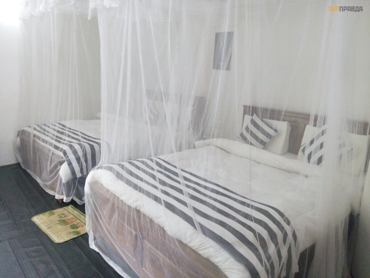 Нас встретила жена хозяина. Повела показать комнату. Из открывшейся двери пахнуло подвальным холодом. Но комната, действительно, по некоторым параметрам тянула на шикарную. Но только по некоторым. Из нее можно было сделать две. Пара огромных кроватей под москитными сетками, плазма.