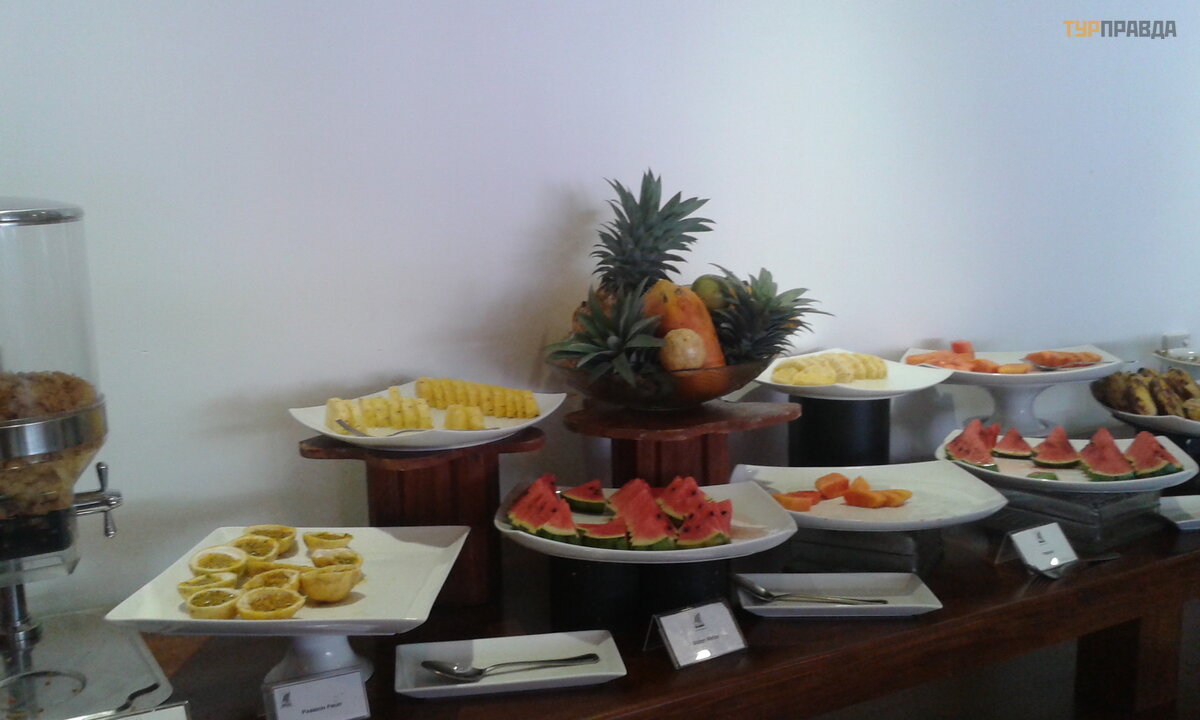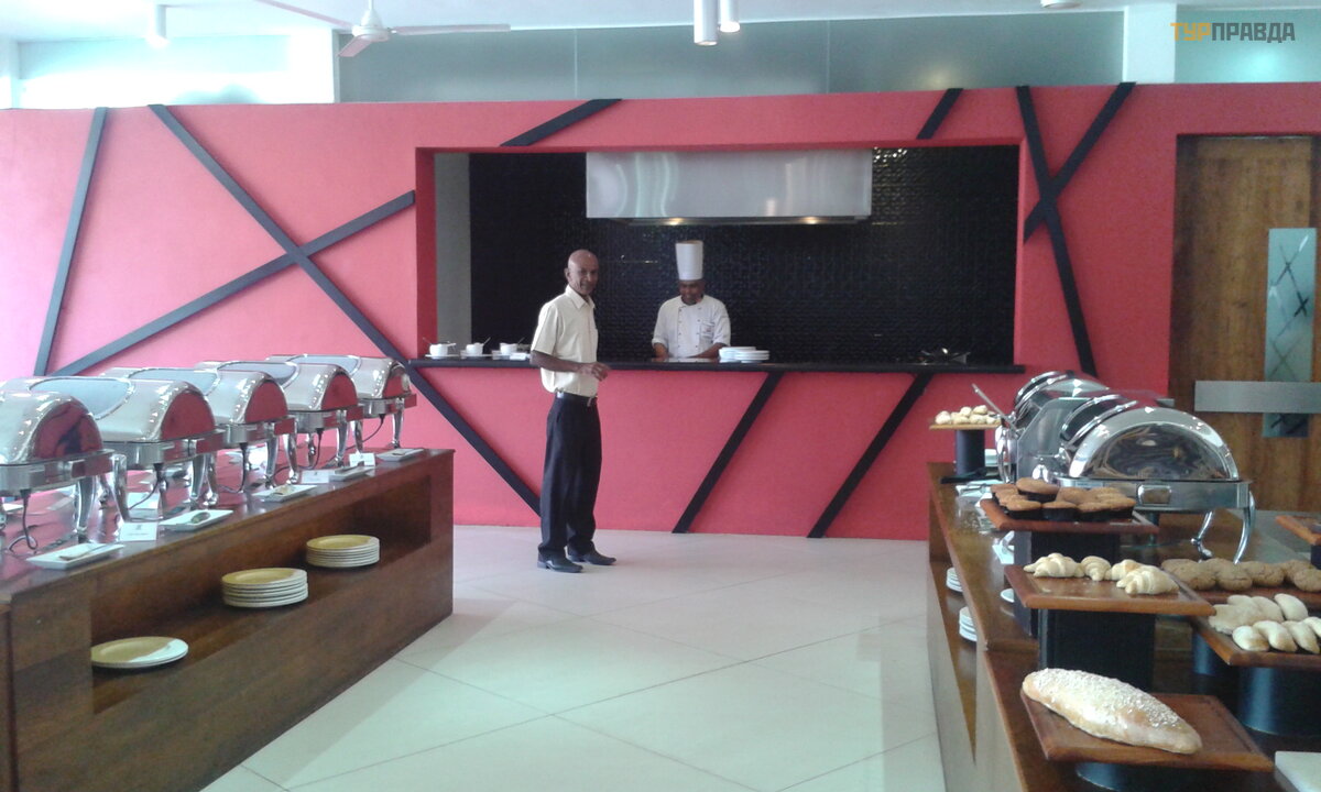 pakiet zawierał ś niadanie i kolację . Pierwszego dnia rano zeszliś my z restauracji, pokazaliś my kartkę z numerem naszego pokoju i zaprosiliś my nas do stoł u. Duż ą wadą jest nasz brak znajomoś ci ję zyka angielskiego. Rosyjski nie jest tam znany. Danie na ś niadanie moż e być obiadem, wiele ró ż nych dań na każ dy gust. W osobnym pomieszczeniu z klimatyzacją znajdował y się pokrojone owoce, sał atki. Dwa rodzaje darmowego ś wież ego soku - chociaż w innych miejscach zwykle pobierają pienią dze za ś wież o wyciś nię ty sok. Herbata, kawa, mleko. Nastę pnie biegniemy na plaż ę . Osobliwoś cią plaż y jest piaszczysta, bez leż akó w. Plaż a znajduje się bardzo blisko hotelu, dlatego leż aki przy basenie cał kowicie zastę pują leż enie na plaż y. Z morza moż esz od razu udać się na swó j leż ak. Na plaż y są irytują cy miejscowi kupcy przeró ż nych rzeczy, ale też coś od nich kupiliś my - pamią tki, perł y (mał o prawdopodobne, ż e są prawdziwe, ale pię kne), lokalne spodnie dla kobiet.