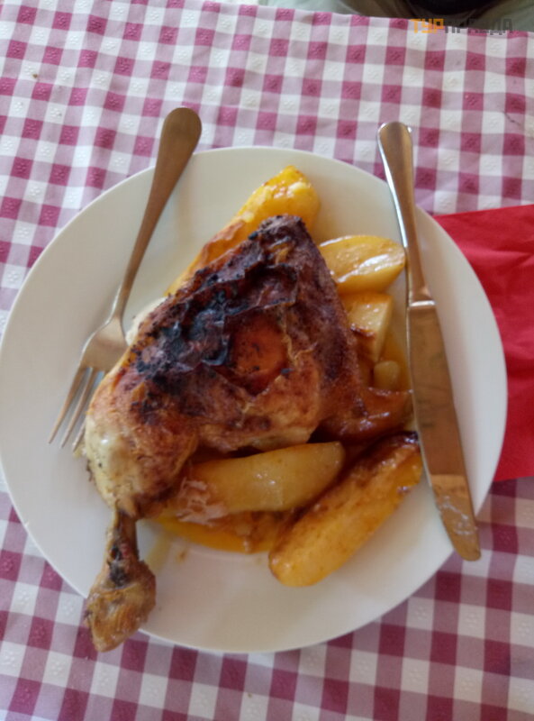 Po przebudzeniu po poł udniu udaliś my się na zwiedzanie. Okazał o się , ż e do morza mamy 10 minut spacerem, do supermarketu 3 minuty, do mał ej tawerny 4 minuty. Postanowiliś my uzupeł nić zapasy energii kompleksowym lunchem o wartoś ci 4 euro w lokalnej konobie. Kelner ostrzegł , ż e drugim bę dzie udko z kurczaka.