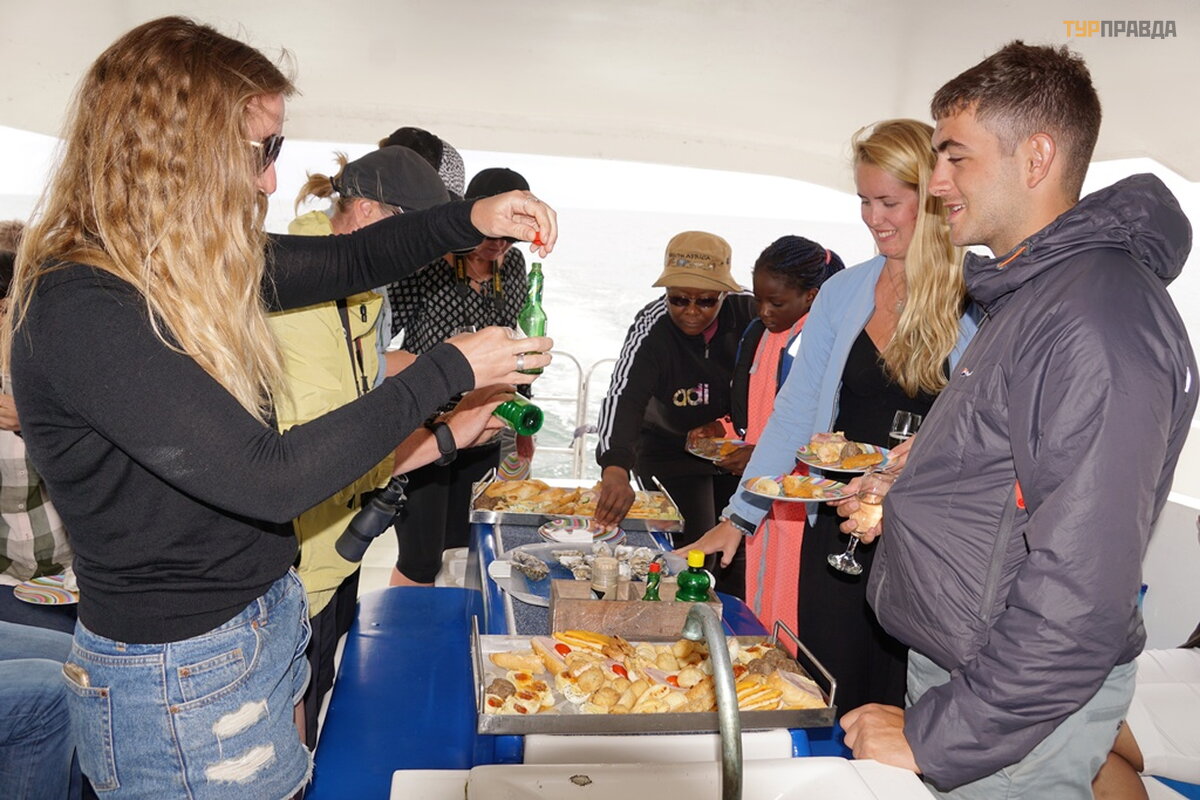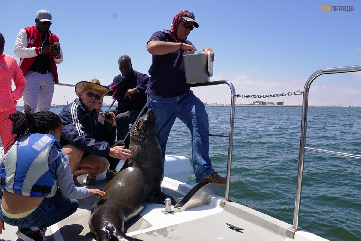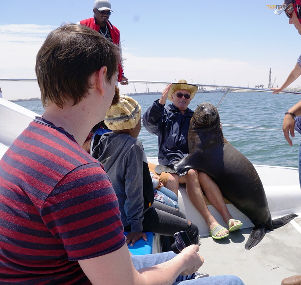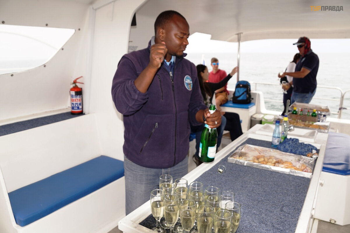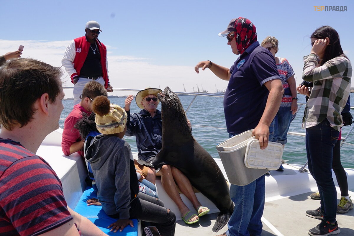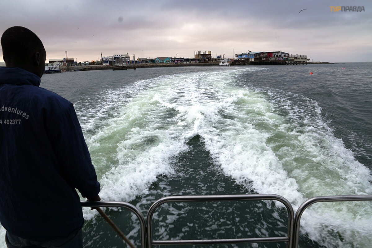 Po przyjeź dzie do Swakopmund od razu zarezerwował em kilka wycieczek, a raczej jedną ł ą czoną za 2000 NAD (9243 ruble), morze i wzdł uż pustynnych wydm jeepem. Bardzo drogie, ale bez nich nie jest ciekawie. Po wspaniał ym ś niadaniu zadzwonił do mnie autobus z już siedzą cymi biał ymi i bardzo opalonymi turystami. Wsiadł em do autobusu i jak zwykle przywitał em się i podał em swoje imię . Wtedy powiedział em im, ż e jestem z Rosji, nasz prezydent Putin. Masz do mnie pytania? Mó wią , ż e nagle na chwilę się uspokoili. co to był o teraz? Potem wszyscy zgodnie powiedzieli i skinę li gł owami, ż e nie ma do mnie ż adnych pytań . Usiadł em na najlepszym miejscu obok kierowcy i wyją ł em aparat, ż eby robić zdję cia podczas jazdy. Przez cał ą drogę w autobusie panował a cisza. Pojechaliś my 45 minut na poł udnie od Namibii do innego kurortu (Walvis Bay) Walvis Bay, Parku Narodowego Namib-Naukluft. Zatrzymaliś my się na parkingu ł odzi, gdzie musieliś my czekać na naszą ł ó dź , któ ra czekał a na swoją kolej na parking. Z brzegu widać był o, jak foki i pelikany pró bował y dostać się na nastę pną ł ó dź , a marynarz odgonił je kijem. W koń cu zał adowano nas i odpł ynę liś my, a foki i pelikany rzucił y się za nami, czasem z wody wyskakiwał y delfiny. Po godzinie ż eglugi rzuciliś my kotwicę , a mewy, pelikany i foki natychmiast rzucił y się w naszą stronę . Nasz przewodnik opowiedział wiele ró ż nych rzeczy, a potem zaczą ł karmić mewy, któ re dziesią tkami napł ynę ł y do naszej ł odzi. Rozpoczą ł się pierwszy pokaz. Turyś ci zaczę li też karmić mewy. Karmił em mewy z rę ki, wię c tak mocno ugryzł y mnie w palce. Okazują się sprytni. Niektó rzy pró bowali tylko zł apać buł kę , podczas gdy inni wyrwali ją prosto z nosa swoim bliskim. Nastę pnie popł ynę liś my na pó ł wysep fok, gdzie od ich liczby zamiast ż ó ł tego piasku pojawił się cią gł y ciemny pas. Tu rozpoczą ł się drugi pokaz z udział em kota, któ remu przewodnik pozwolił wejś ć na naszą ł ó dź . Jaki on jest mą dry. Szybko wspią ł się po schodach i pobiegł na dzió b ł odzi, gdzie siedzieli turyś ci. Pozwalał wszystkim się gł askać i robić z nim zdję cia. Miał em szczę ś cie robić z nim zdję cia, chociaż nieś wiadomi turyś ci zablokowali mojego fotografa, któ ry okazał się zbyt nieś miał y, by na minutę rozproszyć tł um lub zdją ć tył ek z siedzenia na ł odzi. Po otrzymaniu porcji ryb kot wskoczył do oceanu i zjedliś my obiad. Jeden marynarz otworzył muszle oceanu mię sem, inny rozł oż ył jedzenie, a trzeci nalał szampana. Wszyscy jedli duż o, a jedzenia był o duż o, na przykł ad szampana. Turyś ci byli trochę powolni. Pili po cichu bez tostó w. Proponował em pić turystom ze wszystkich krajó w, a oni pili po cichu. Musiał em wypić butelkę szampana, a przewodnik nadal oferował , ale nie mogł em już pić , ponieważ przejadał em się ró ż nymi brutalami. Kierowca ł odzi też bez przerwy pił .