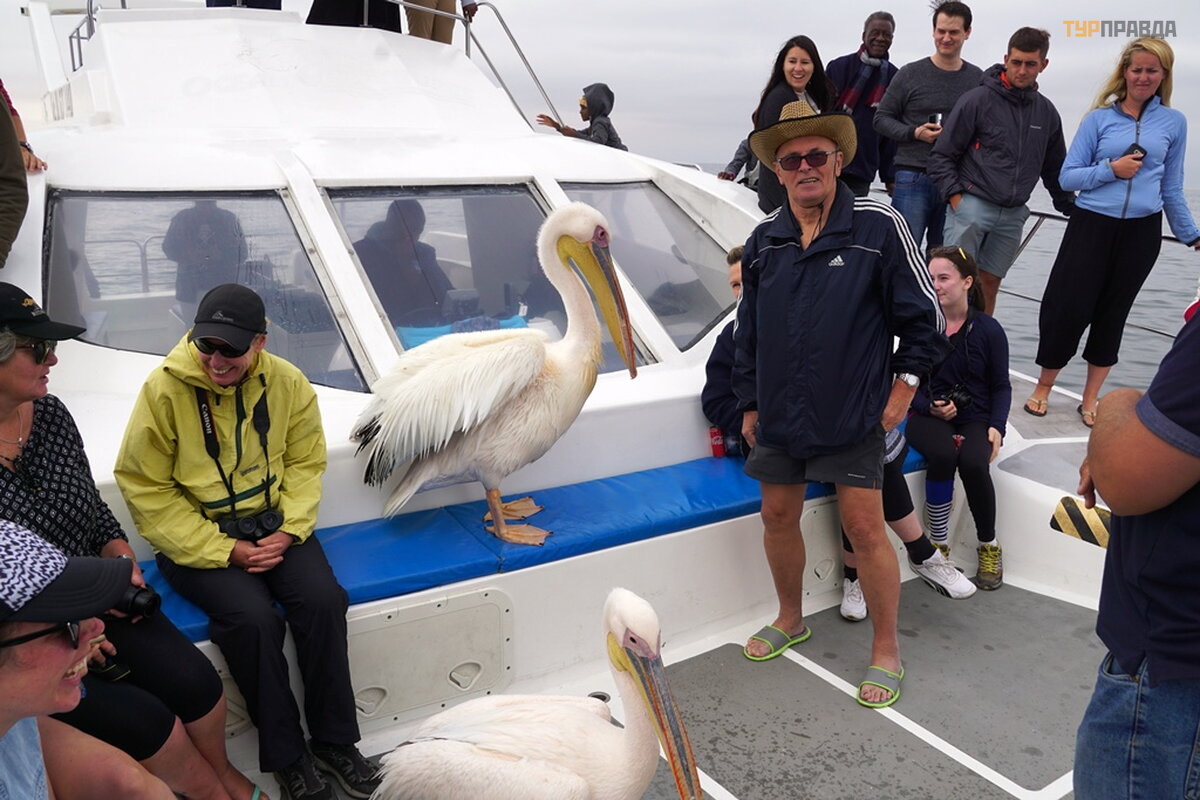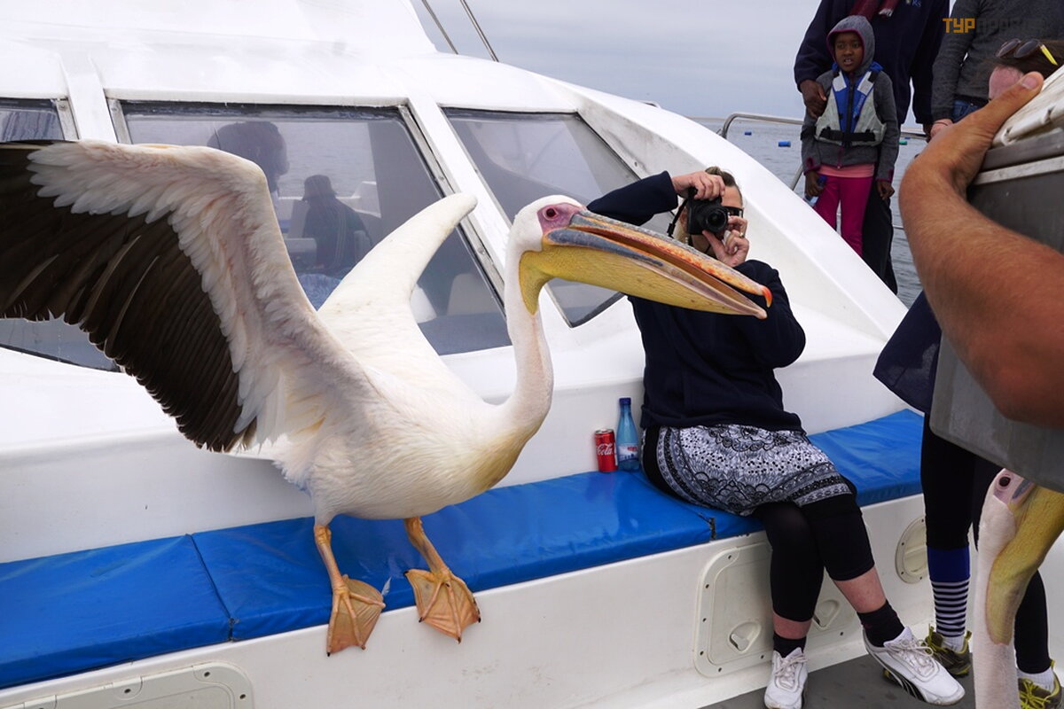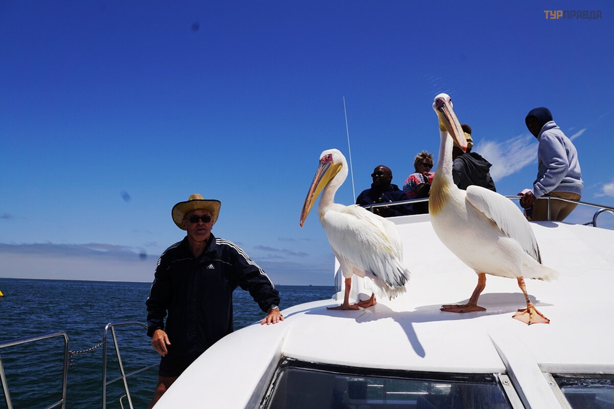 Po obiedzie podpł ynę liś my w pobliż u fokarium. Ciekawie był o ich oglą dać . Mał ych kotó w pilnował a jedna gł ó wna matka. Najważ niejszy tata, gruby i ogromny, czuwał nad porzą dkiem w swojej kolonii. Dwadzieś cia minut pó ź niej wypł ynę liś my i zatrzymaliś my się ponownie, gdzie natychmiast zebrał y się pelikany. Spektakl trwał dalej. Wszyscy turyś ci zaczę li robić sobie z nimi zdję cia. Pię tnaś cie minut pó ź niej przewodnik zaczą ł ich odpę dzać . Pelikany odmó wił y odlotu i zaż ą dał y kontynuacji bankietu, ale ryba już się dla nich skoń czył a. Zdają c sobie sprawę , ż e nic im nie zabł yś nie, pelikany niechę tnie odleciał y w poszukiwaniu kolejnej ł odzi z turystami. Pię ć godzin minę ł o niezauważ enie i wylą dowaliś my na brzegu miasta. Niektó rzy turyś ci poszli do hoteli, a ja przesiadł em się do jeepa i pojechaliś my na niekoń czą ce się wydmy Namibii jeszcze dalej na poł udnie kraju.