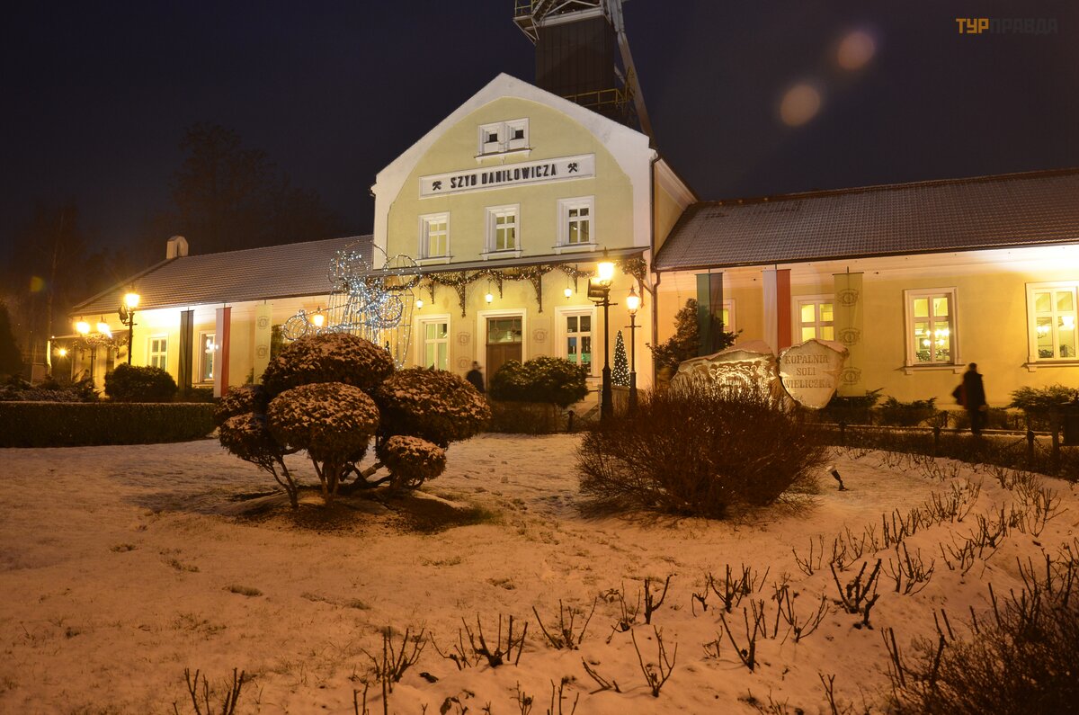 Wieczorem Wieliczka przyjemnie zadowolona mię kkim oś wietleniem domó w i ulic.