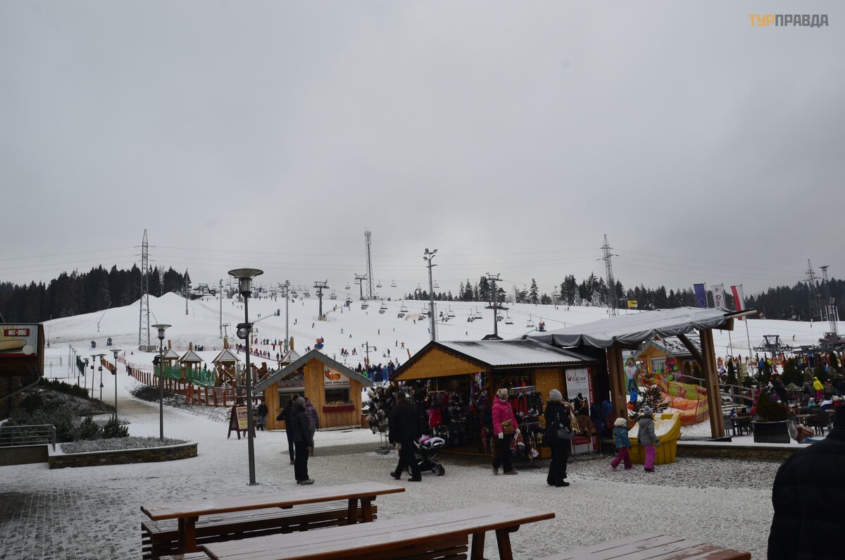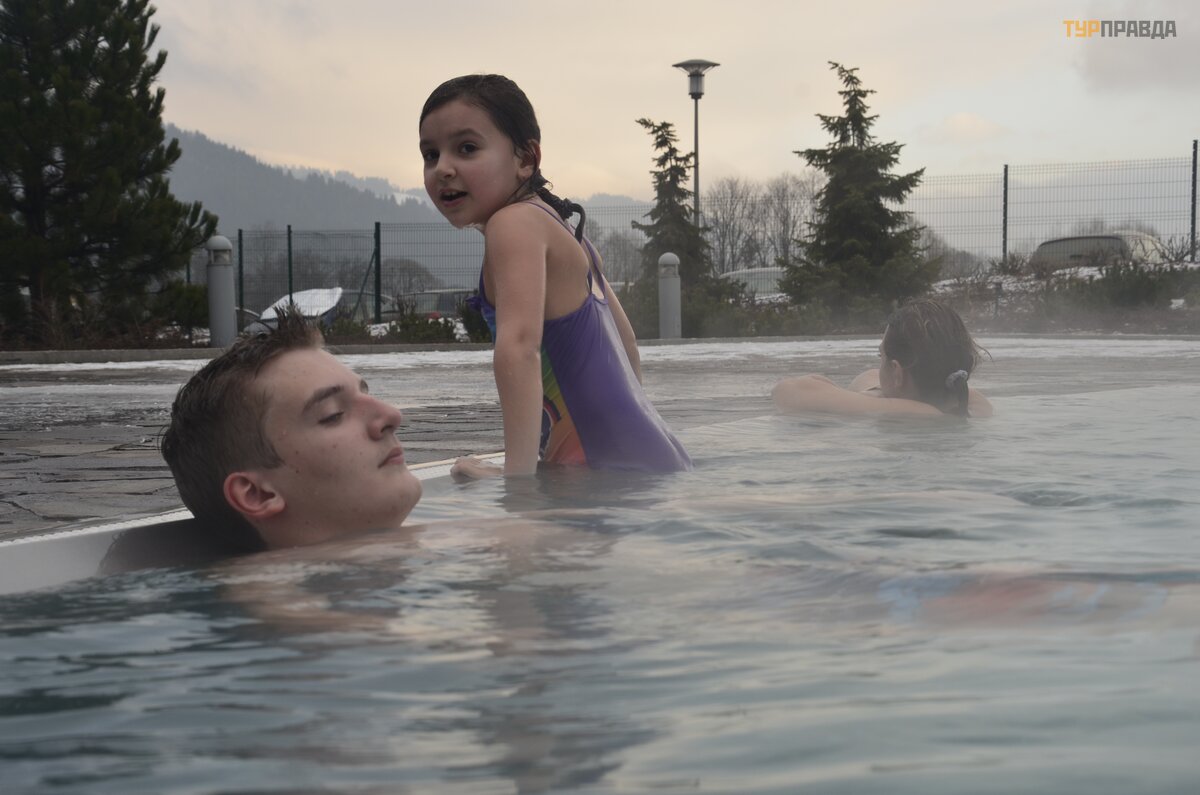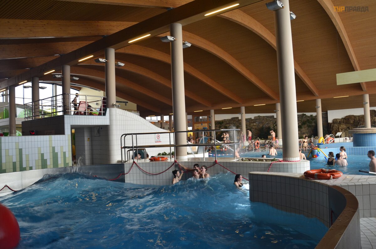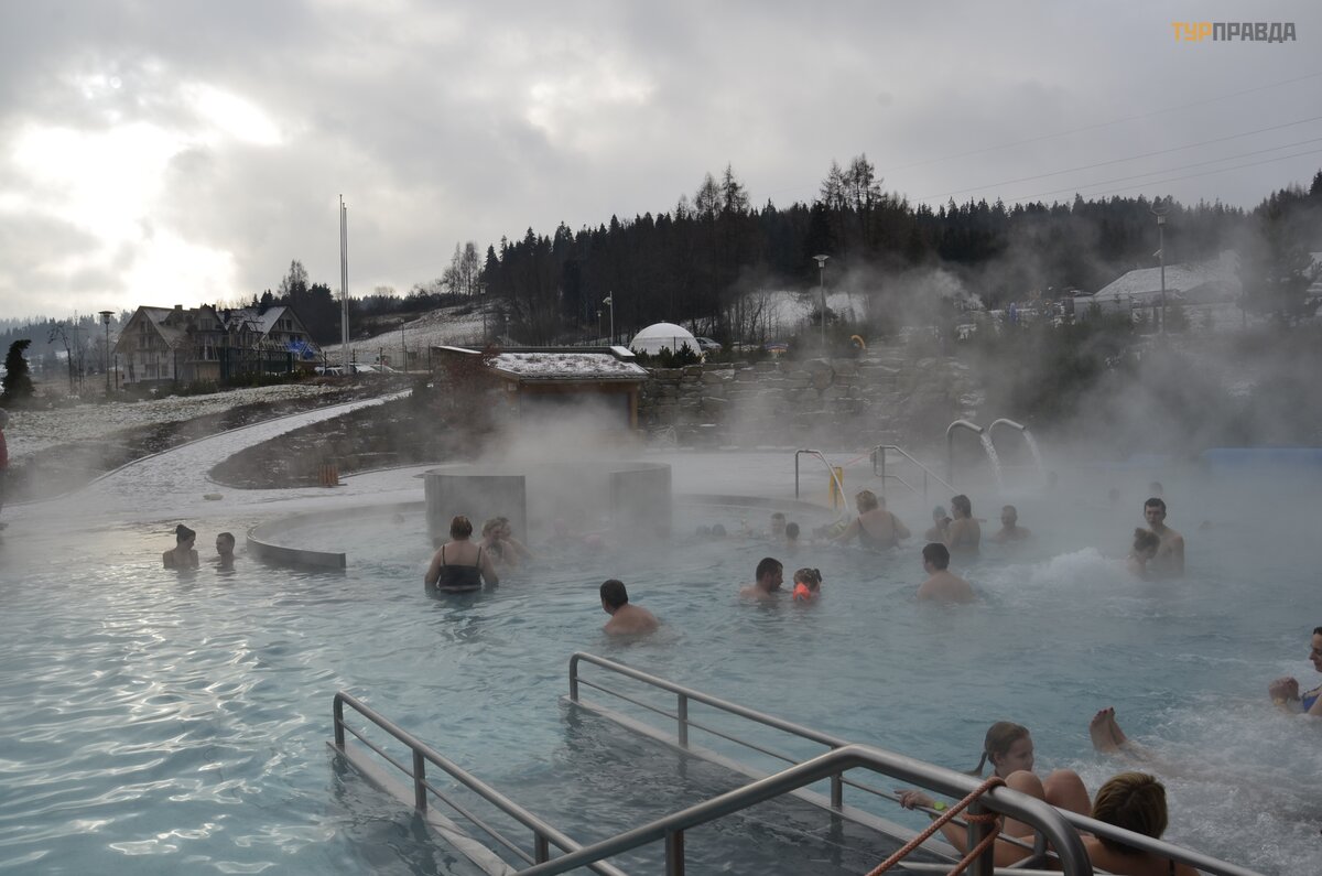 Korzystne poł oż enie przy stokach narciarskich zapewnia stał ą obecnoś ć duż ej liczby odwiedzają cych. Wewną trz terytorium podzielone jest na kilka stref: aktywną , gdzie znajdują się zjeż dż alnie i strefa dla dzieci; strefa relaksu i strefa ką pieli. Zaoszczę dziliś my bilety na pierwsze dwa. Chciał abym zwró cić uwagę na wysoką temperaturę wody w basenach kompleksu, aby po 20-30 minutach pobytu zamieniał a się Pani w gotowane ryby z chę cią odś wież enia. Przyczyniają się do tego odkryte baseny.