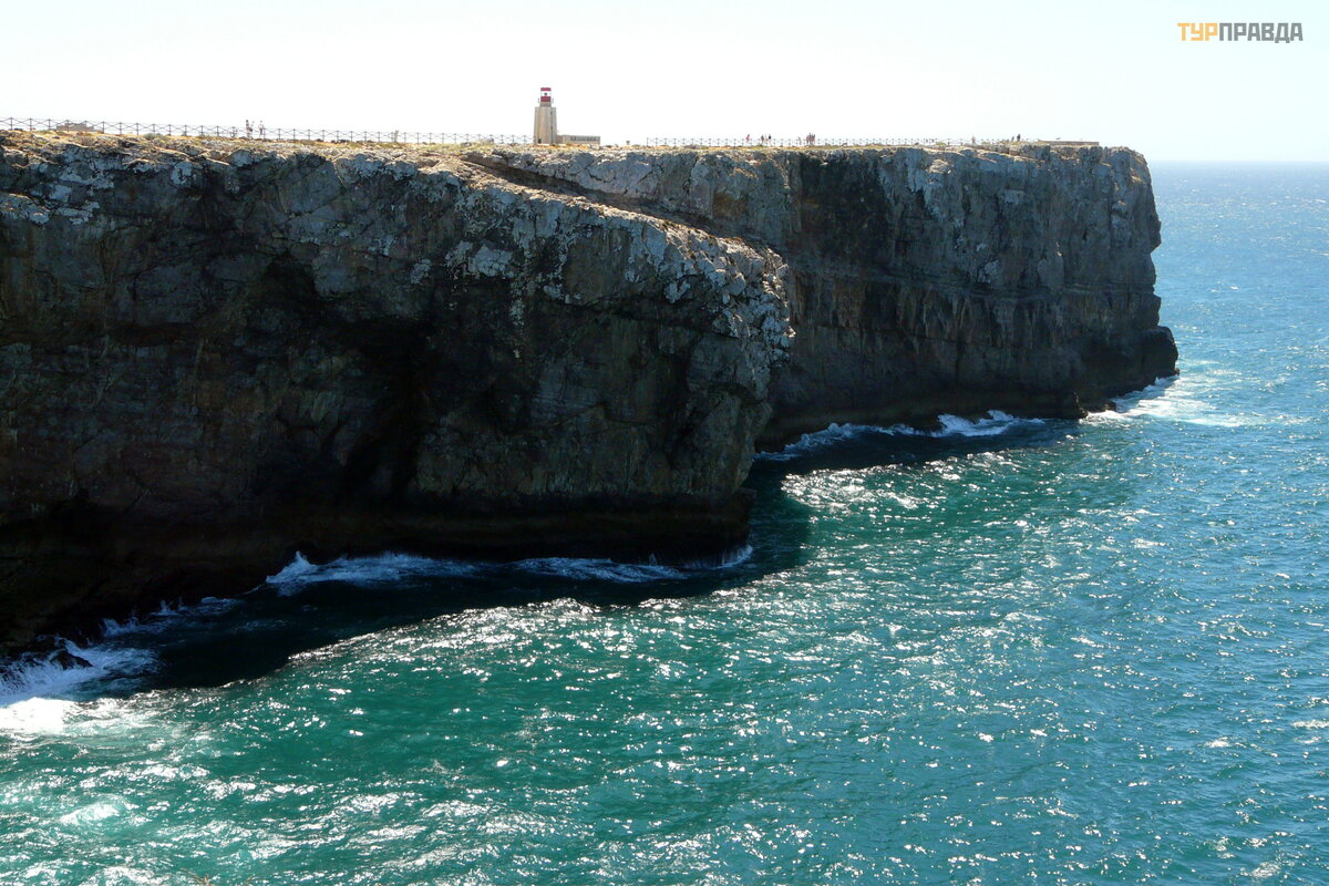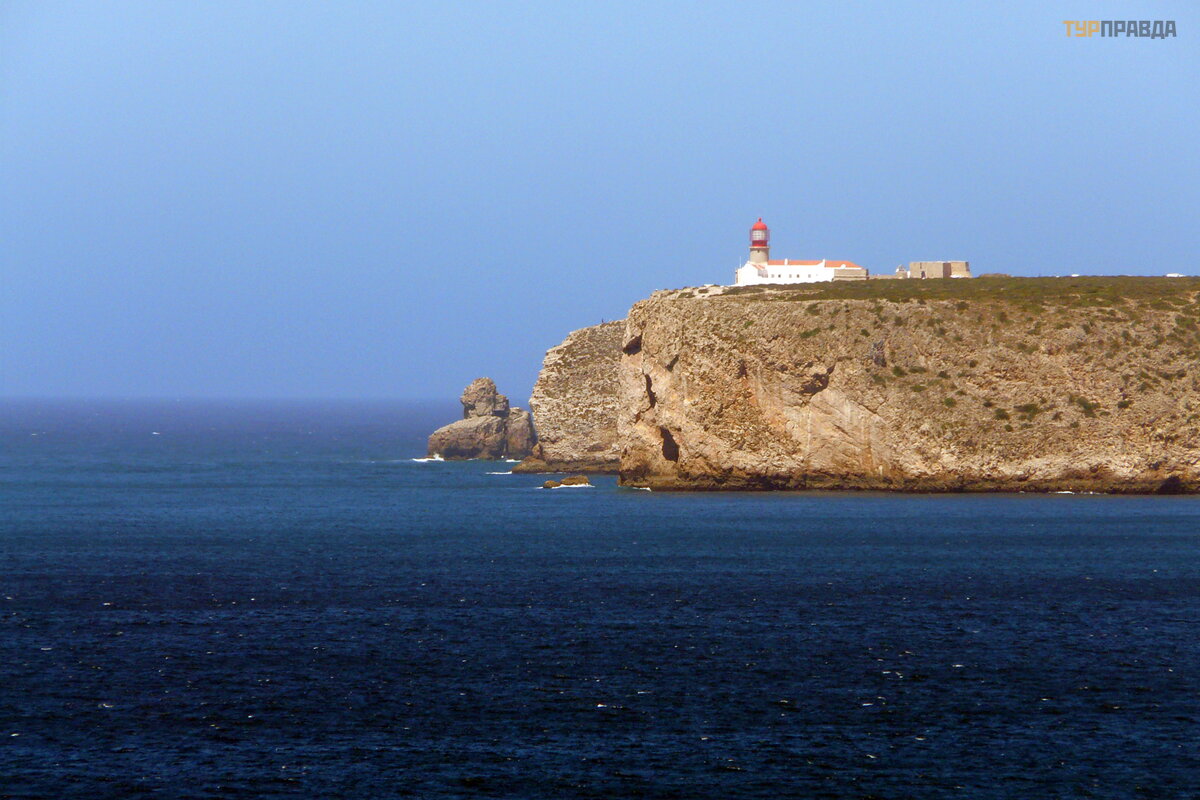 W oddali widać przylą dek San Vicente (Cabo de Sao Vicente) - najbardziej wysunię ty na poł udniowy zachó d punkt kontynentalnej Europy. Przylą dek zawsze sł uż ył jako punkt orientacyjny dla ż eglarzy. Teraz na jej szczycie znajduje się latarnia morska o zasię gu 95 kilometró w. Ze wszystkich istnieją cych latarni morskich w Europie ta jest najpotę ż niejsza.