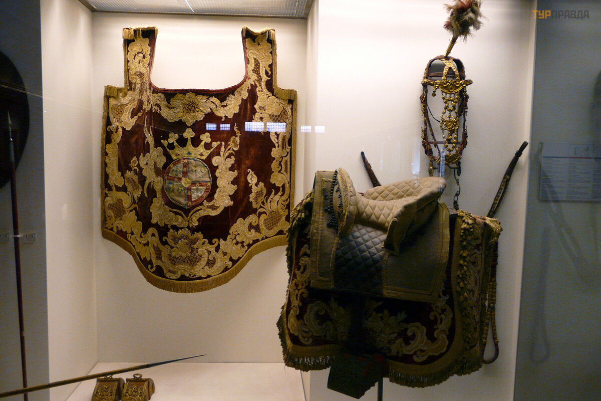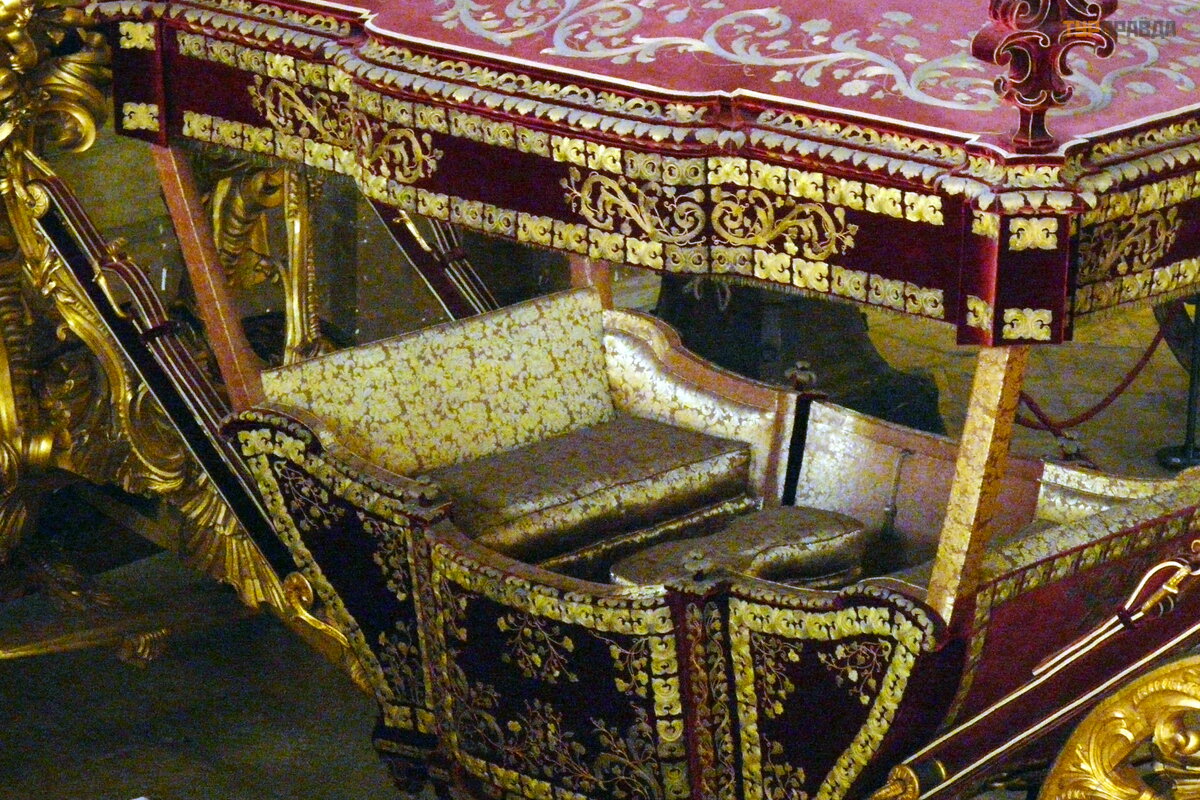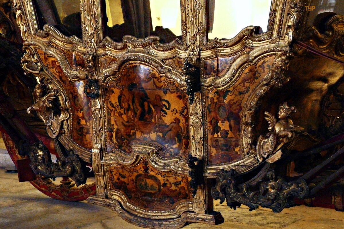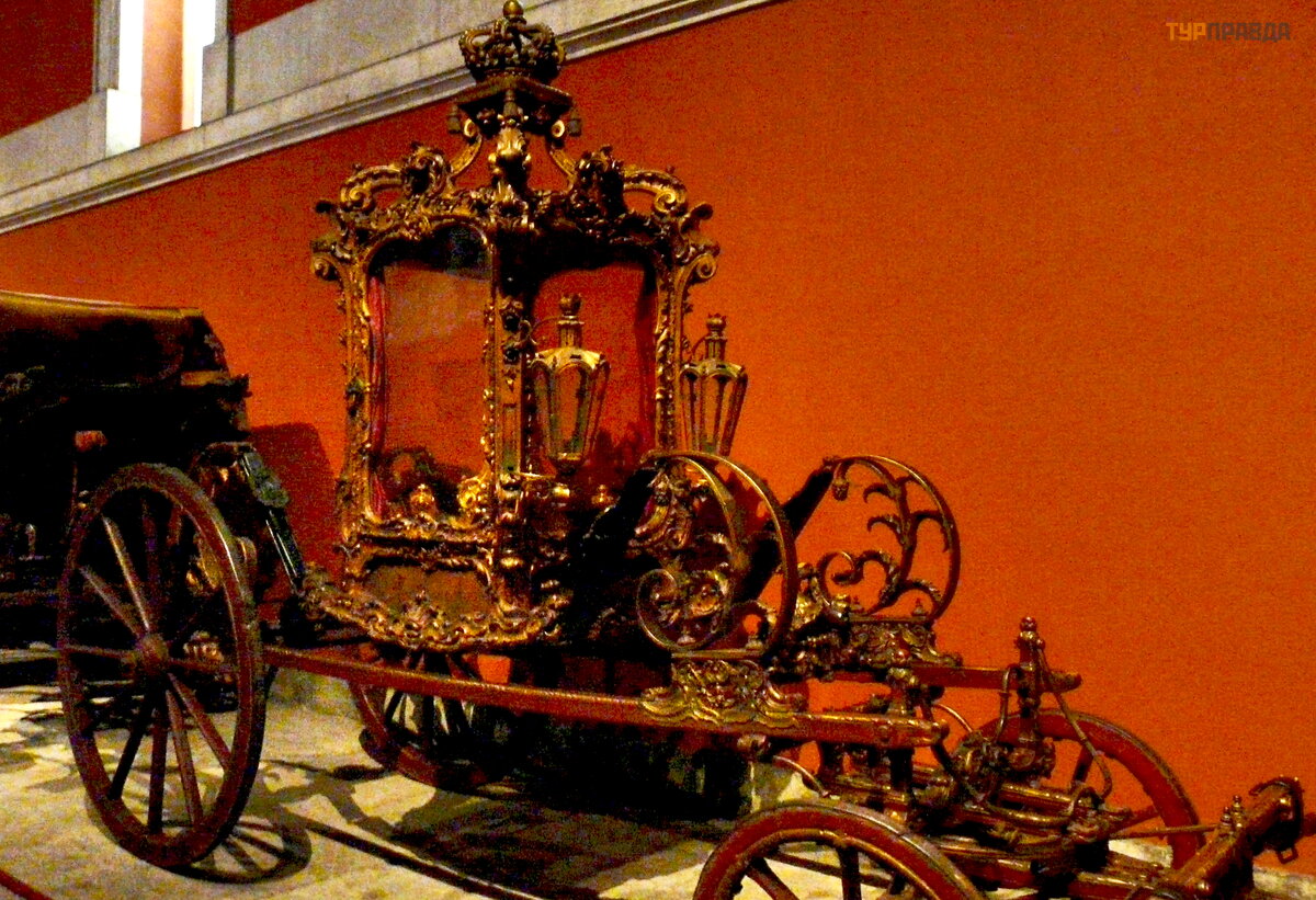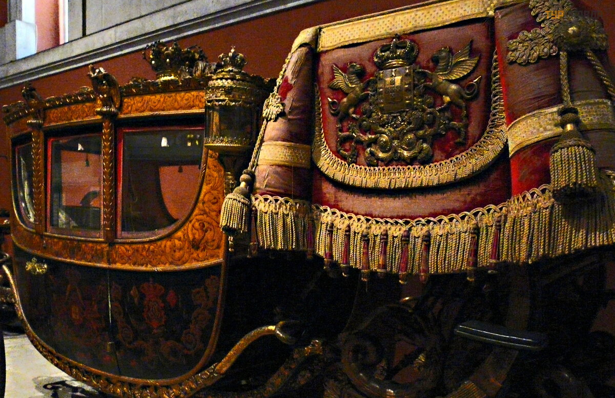 В конце зала стоят три огромные барочные кареты, изготовленные в Риме для посла Португалии в Ватикане: в 1716 году король Жоао V отправил большое посольство в Ватикан. К тому моменту лучшие времена португальской империи были уже позади, но тщеславному монарху хотелось пустить пыль в глаза Папе Римскому и продемонстрировать, что и на краю Европы живут не « Бог знает кто» . Для этого в Риме было заказано пять роскошных карет, выполненных по эскизам португальских художников, три из которых сохранилась до наших дней.