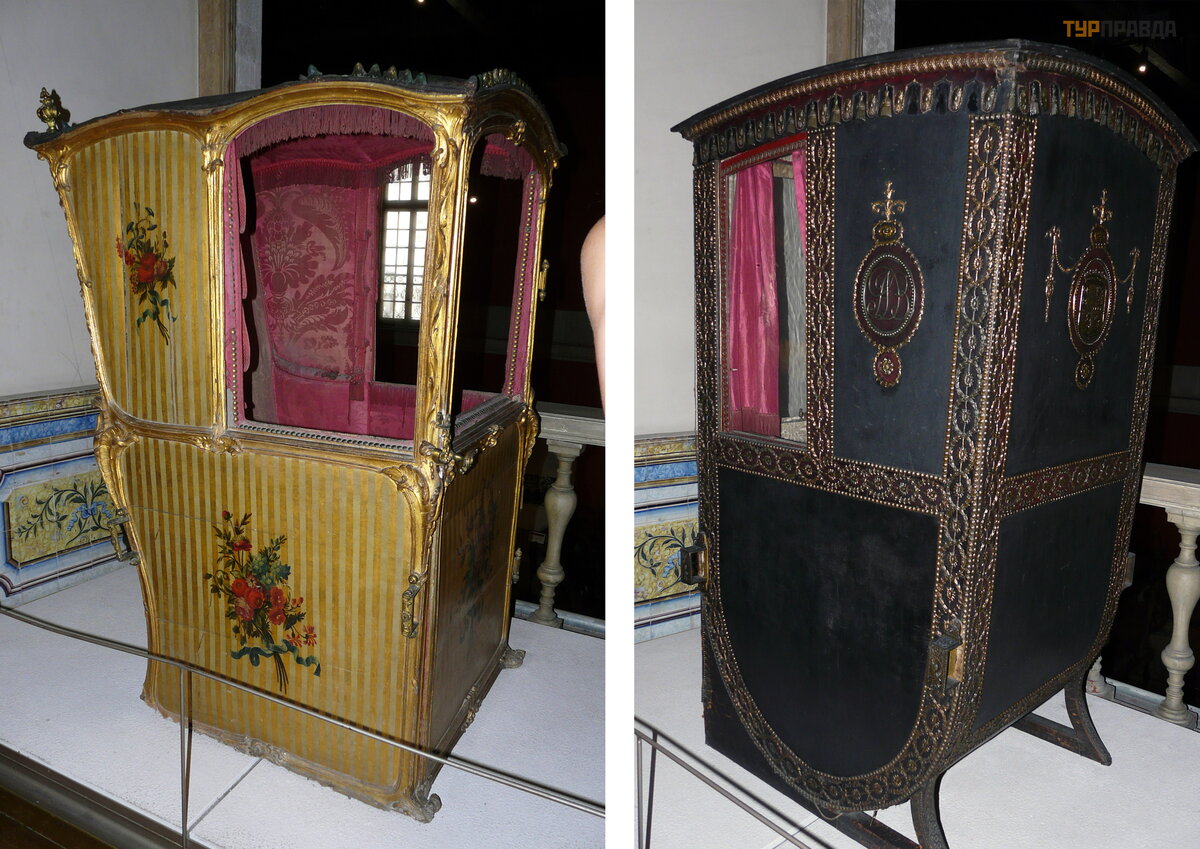 Самый старый и самый ценный экспонат коллекции, датируемый концом XVI – началом XVII века, – карета короля Испании Филиппа II, на которой он приезжал в Португалию в 1619 г. Карета не только самая старинная, но и самая скромная. Менялась мода – изменялось и оформление экипажа. С течением времени кареты становились все роскошнее и изысканнее, появилась отделка из бархата, позолоты и красного дерева, их начали украшать статуями и канделябрами.