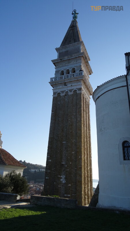Znakiem rozpoznawczym Piranu jest gó rują ca nad miastem dzwonnica, bardzo podobna do dzwonnicy ś w. Marka w Wenecji. To jest taras widokowy i znowu nasz galop uniemoż liwia nam wspinaczkę na dzwonnicę .