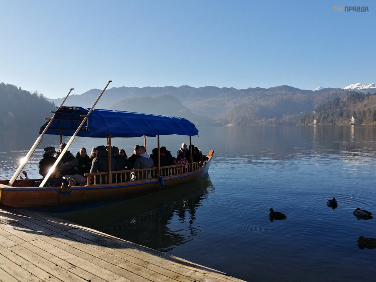 Pletni to mał e kryte ł odzie z rzę dami siedzeń po obu stronach. Zaproponowano dwie opcje: 1) zamek; 2) wyspa na ł odzi. My wybraliś my zamek, na ł ó dce jest trochę zimno i wcale nie ż ał owaliś my - widoki są bajeczne. W mroź ne zimy jezioro zamarza i otwiera się na nim lodowisko.