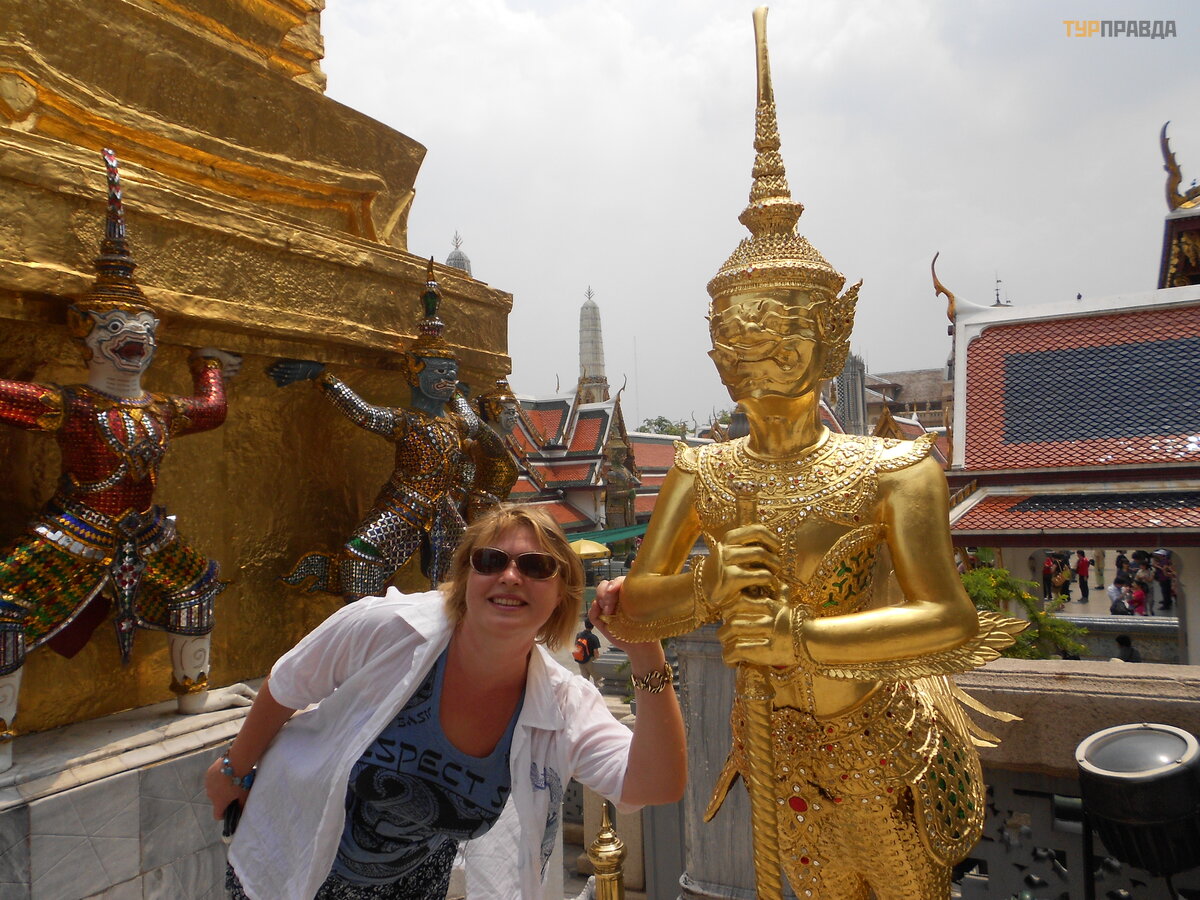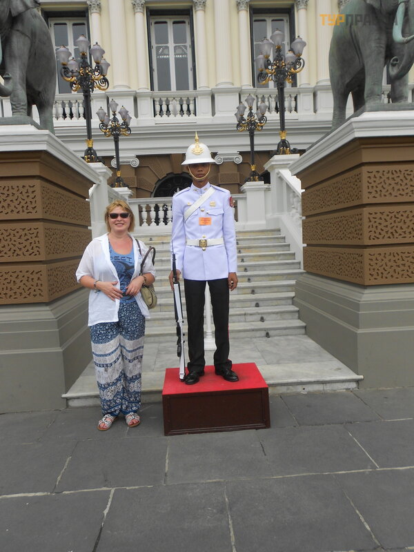 Большой Королевский дворец - это одновременно и религиозная святыня Таиланда, и исторический памятник, и музей под открытым небом, в котором выставлено все самое впечатляющее, что создано руками человека. По его территории можно бродить часами, восхищенно рассматривая красивейшие храмы, статуи, деревья и цветы. Все запомнить и даже обойти с первого раза невозможно, выматывает жара и обилие измученных красотами туристов. Но в храм Золотого Будды я попала, и даже загадала желание… Сфотографировалась с золотой птицей счастья и с юным солдатиком, невозмутимо стоявшим на 40-градусной жаре в полной амуниции, а также посетила музей текстиля. В музее текстиля царила приятная прохлада, экспонировались богато разукрашенные платья и костюмы, в которых щеголяли члены императорской семьи и тайские оперные дивы. Так же с интересом я просмотрела короткий видеофильм, в котором был показан процесс изготовления шелковых тканей – от выращивания гусениц, сбора коконов, вымачивания и покраски ниток и т. п. до получения готового полотна.