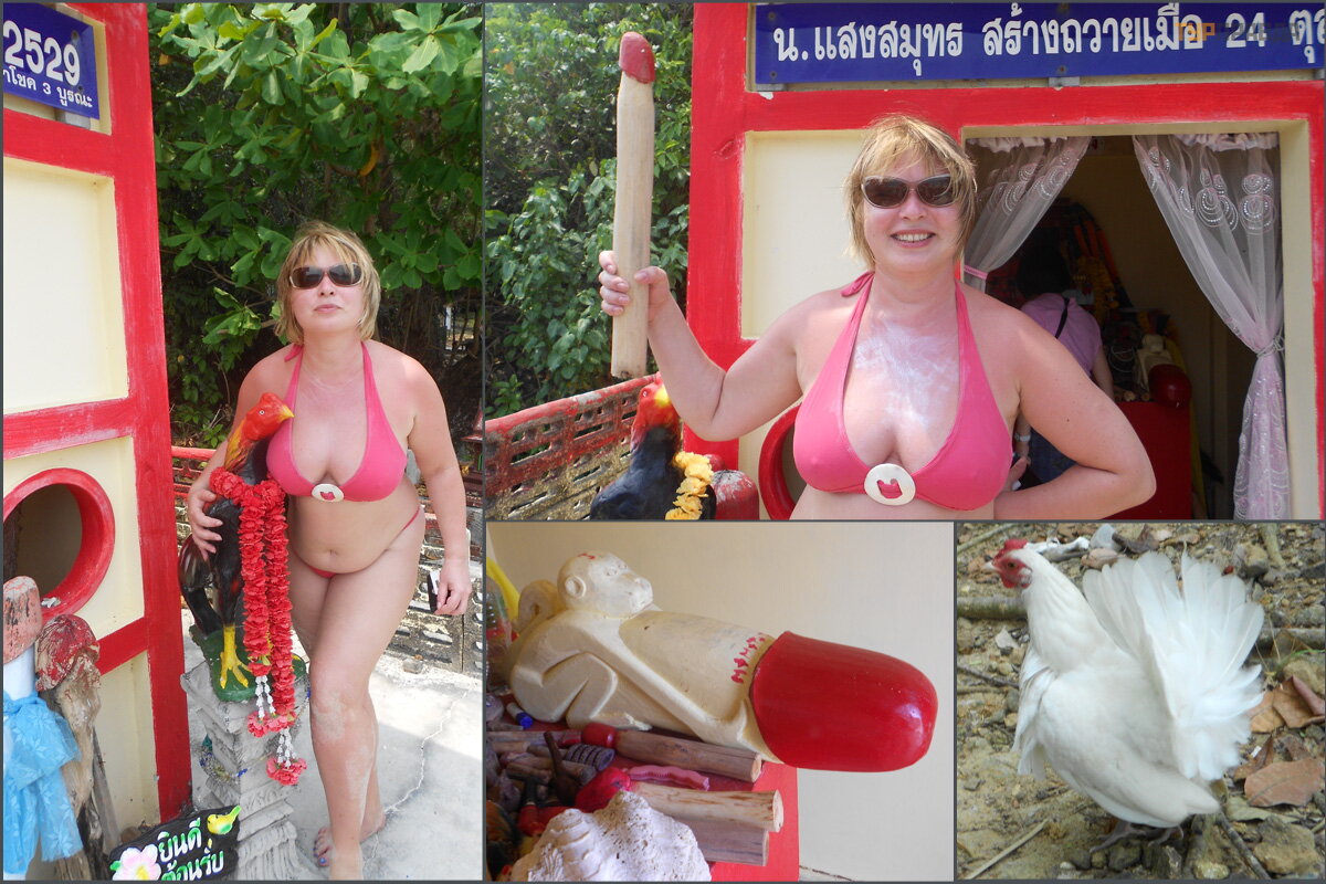 Так же мы посетили необитаемые острова, вокруг которых можно поплавать с маской и трубкой и полюбоваться подводными красотами. Добирались до места на катере, который делал три остановки возле рифов и островков. Поначалу я никак не могла справиться с плавательным инвентарем – зажеванная туристами общественная трубка пропускала воду, маска нещадно давила. Вывод: хотите получить удовольствие от созерцания морских ежей – берите с собой проверенные приспособления. Второй остров оказался не таким уж и необитаемым: в джунглях « маячила» новостройка – сортир « веселенького» зеленого цвета, по берегу бродила белая курица. А невдалеке на каменистом берегу виднелся маленький храм. Это оказался тайский храм плодородия – на алтаре и возле входа стояли статуи петухов и курочек, а так же многочисленные деревянные фаллосы различных размеров. Туристы с удовольствием фотографировались со всеми этими красотами, а русские путешественники обозвали это дивное строение простенько и пошловато « Писькин дом» .