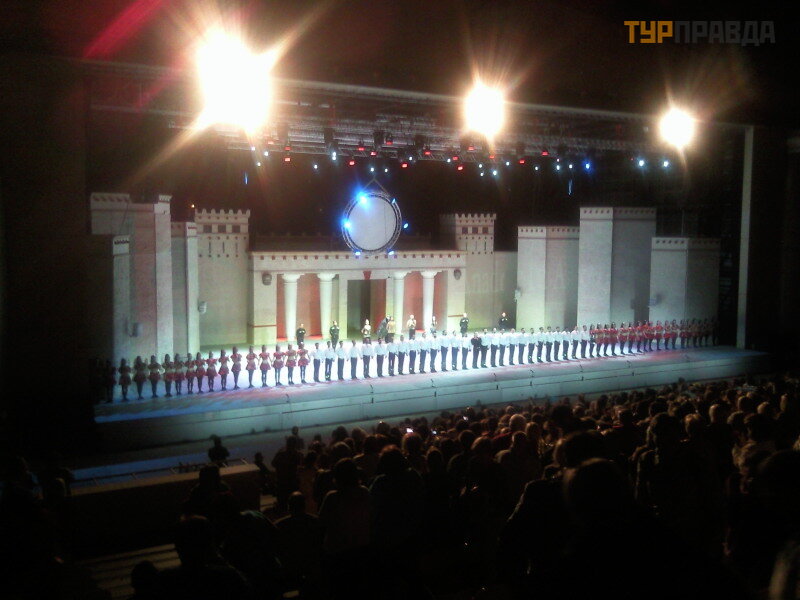 . Przedstawienie odbył o się nie w amfiteatrze Aspendos, gdyż ten był obecnie w trakcie renowacji, ale w jego kopii. Sala był a pod goł ym niebem, a siedzenia tutaj był y oczywiś cie okropne. Ale w samym amfiteatrze w ogó le nie był o miejsc siedzą cych, o ile rozumiem! ! ! Dodatkowo, zgodnie z radą przewodnika, zabraliś my ze sobą rę czniki plaż owe z hotelu.