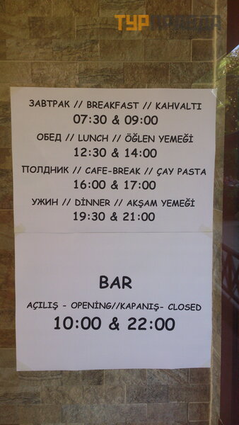 Расписание питания есть в Номерах и на входе в Отеле во внутренний дворик.