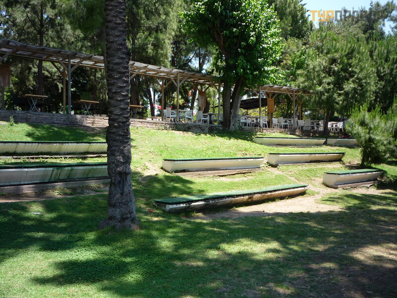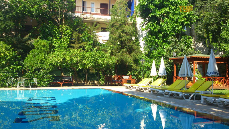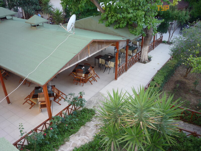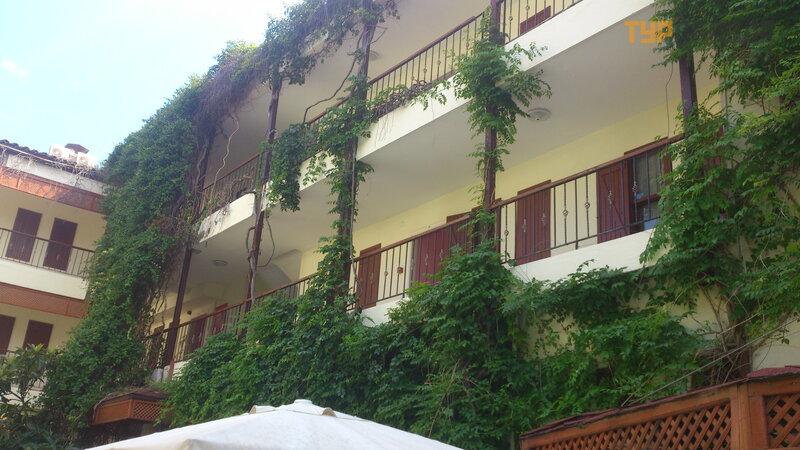 СТОЛОВАЯ и БАССЕЙНЫ – расположены внутри дворика Отеля. Всё в зелени, растут лимоны и открывается отличный вид на ставни Номеров Отеля – просто завораживает… Турция!