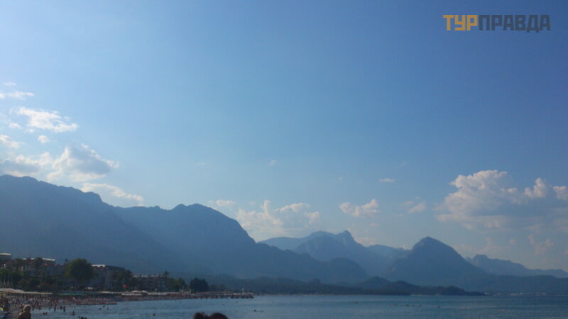 По пути в Кемер нас сопровождала русскоговорящая девушка Аня – студент на практике из Запорожья, всех несколько раз переспрашивала который раз в Турции – все сказали, что не первый, поэтому, видимо, она особо много не рассказывала, так, что у всех была возможность спокойно насладиться пейзажем: море и горы, класс! Дорога занимает около часа. Покрытие – отличное, асфальт – прямо на выставку отправляй. Вдоль дорога украшена искусственными насаждениями и естественными украшениями: горы, свежий воздух и побережье моря.