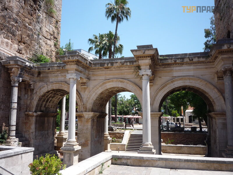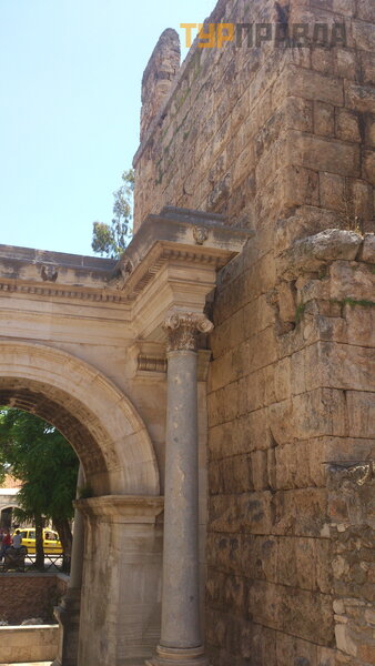 RYS HISTORYCZNY: Antalya został a zał oż ona w 159 pne. Grecki kró l Pergamonu Attalus II i pierwotnie nazywał się Attalia. W 133 pne. Miasto został o zdobyte przez Rzymian, stają c się zimową rezydencją cesarza Hadriana. Antalya przez dł ugi czas był a w posiadaniu Rzymu, a nastę pnie Bizancjum. Uważ a się , ż e Brama Hadriana został a wmurowana w mury miejskie na specjalną okazję - na cześ ć przybycia cesarza rzymskiego Hadriana do Antalyi w 130 roku n. e. Został y zbudowane jako ł uk triumfalny, dlatego szczegó lnie zachwycał y swoim przepychem i wielkoś cią .