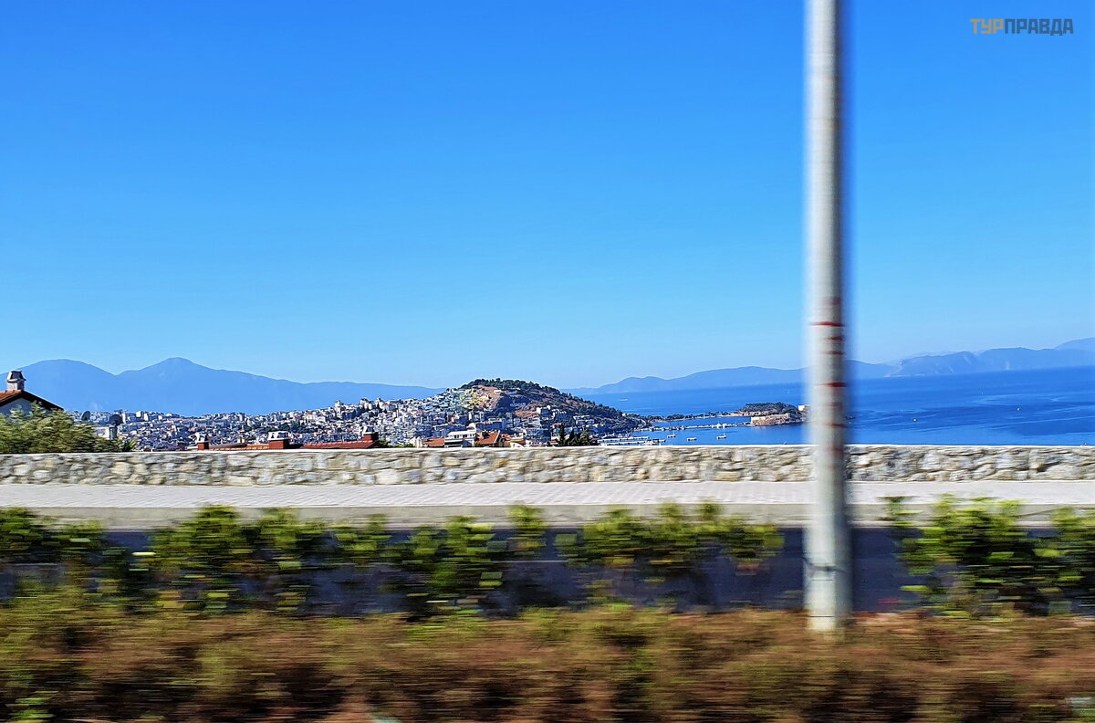 Kolorowa gó ra Kese w Kusadasi z okna autobusu