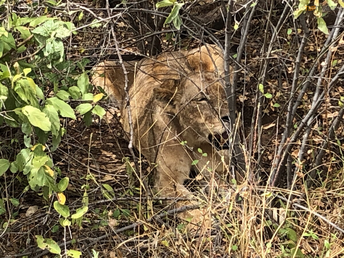 W tym samym czasie inne lwice i lew, któ ry już zjadł , leż ał y w krzakach wokó ł i strzegł y padliny. Byli dosł ownie trzy metry od samochodu, ale mogliś my je zauważ yć dopiero, gdy kierowca pokazał , gdzie się znajdują .