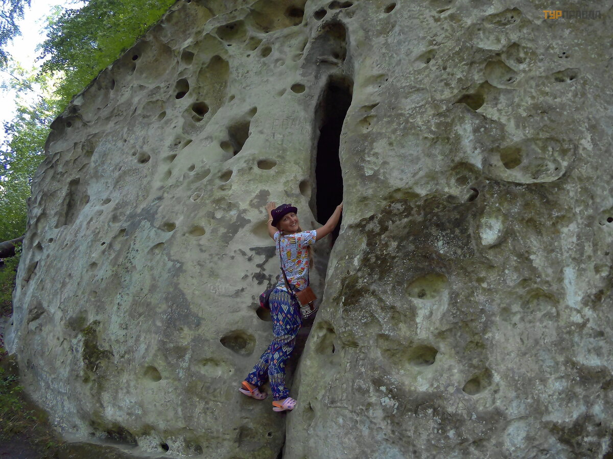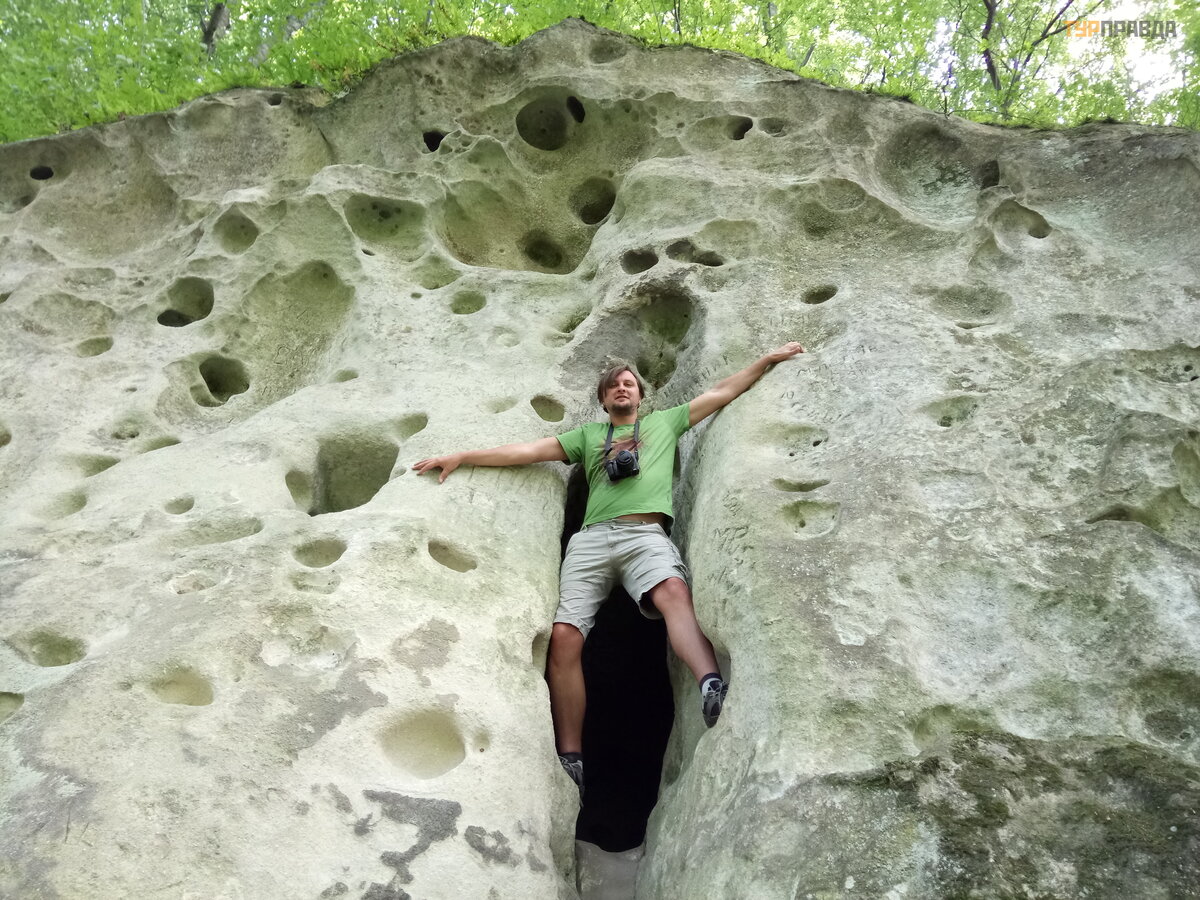 Miejsce skł adania ofiary, na któ rym widać odpł ywy krwi ofiarnej, schody do miejsca, w któ rym stał wizerunek Peruna, oraz cokó ł , na któ rym widnieje symbol trzech ż ywioł ó w: ognia, wody, powietrza – to wszystko jest widoczne tuż przy drodze. A do sanktuarium trzeba dostać się do wsi Iliv i wczoł gać się na strome wzgó rze. Był o bardzo ś lisko i od czasu do czasu nasze stopy pró bował y wstać , ale wspię liś my się na gó rę i spojrzeliś my na to sanktuarium. Zostawię tu tylko zdję cie, ż eby ocenić skalę .