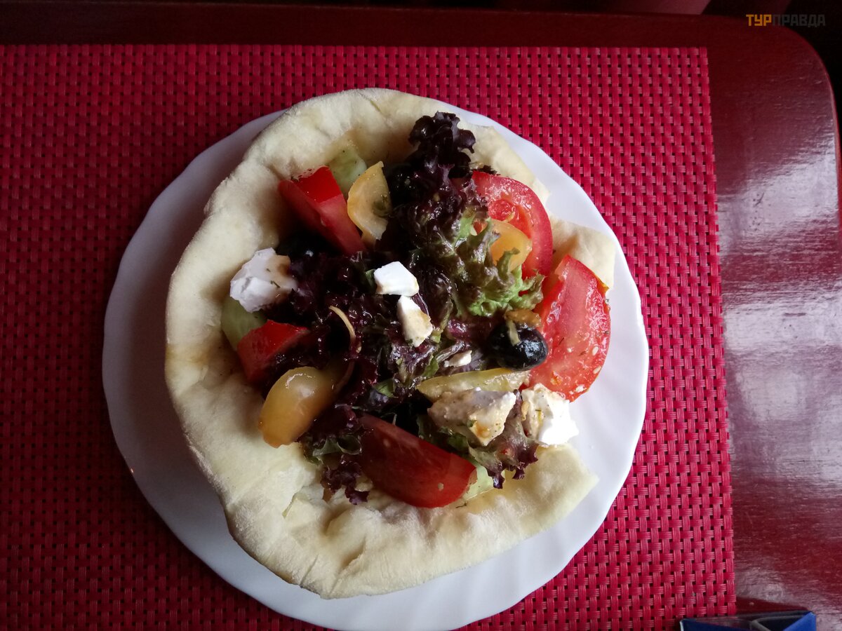 Ale po prostu nie robiliś my kawy i pró bowaliś my sał atki greckiej w chlebie. Pierwszy raz widzę sał atkę podawaną w bochenku chleba. I jest bardzo smaczny.